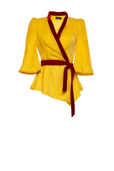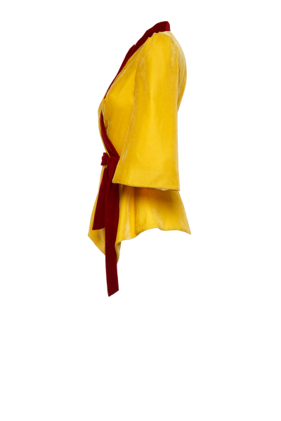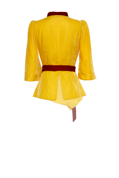 Бархатный жакет с баской, контрастные планка горловины и пояс рукава ¾ «колокол», разрез сзади
