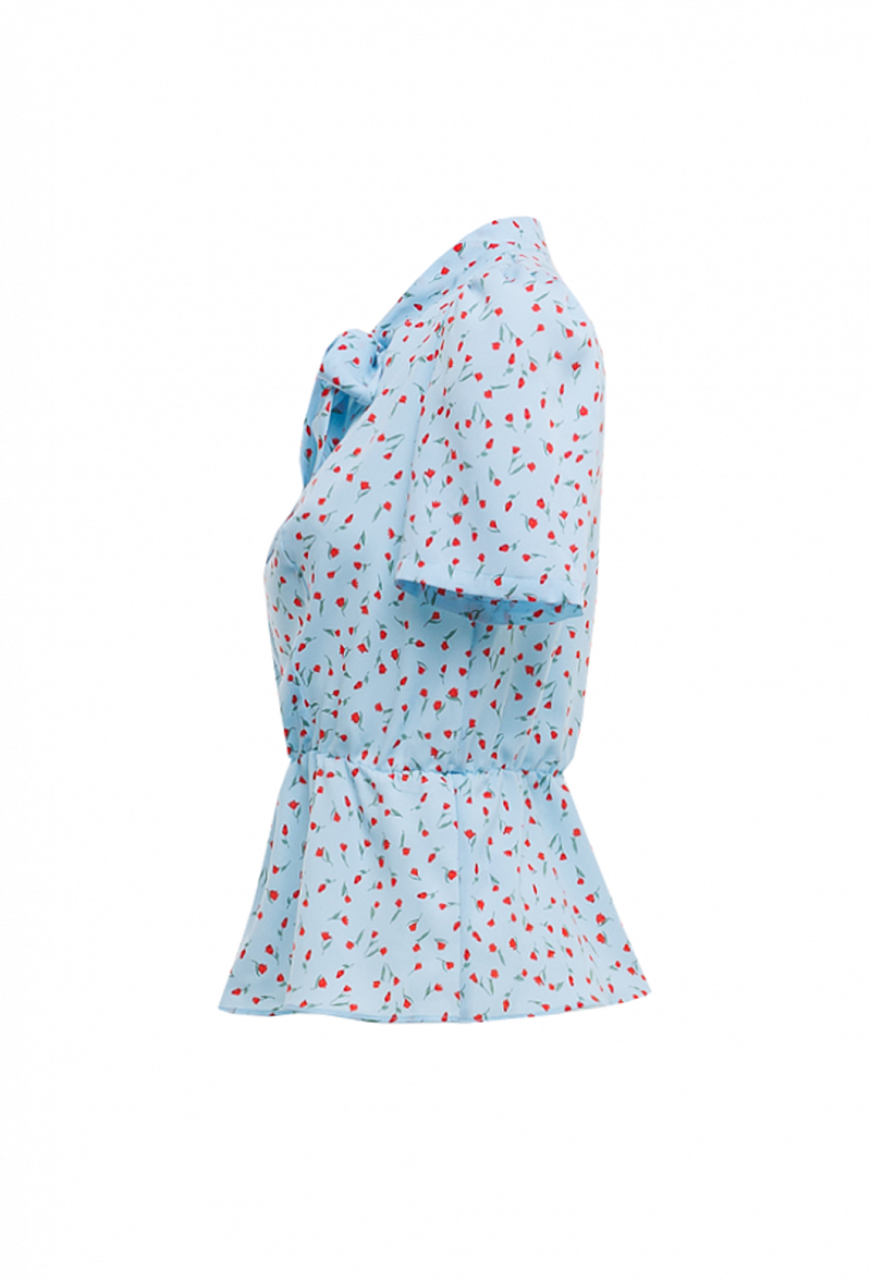 Блузка с коротким рукавом, воротник стойка переходящая в бант, с резинкой по талии. Ткань голубая с мелким принтом.