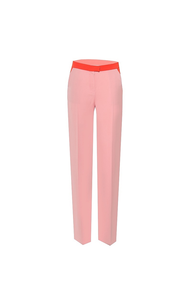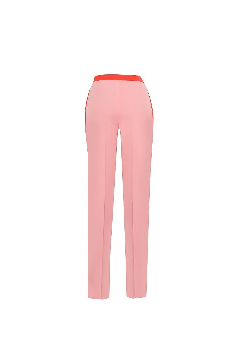 Розовые повседневные брюки, зауженные к низу с красными лампасами.