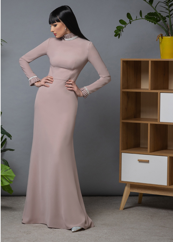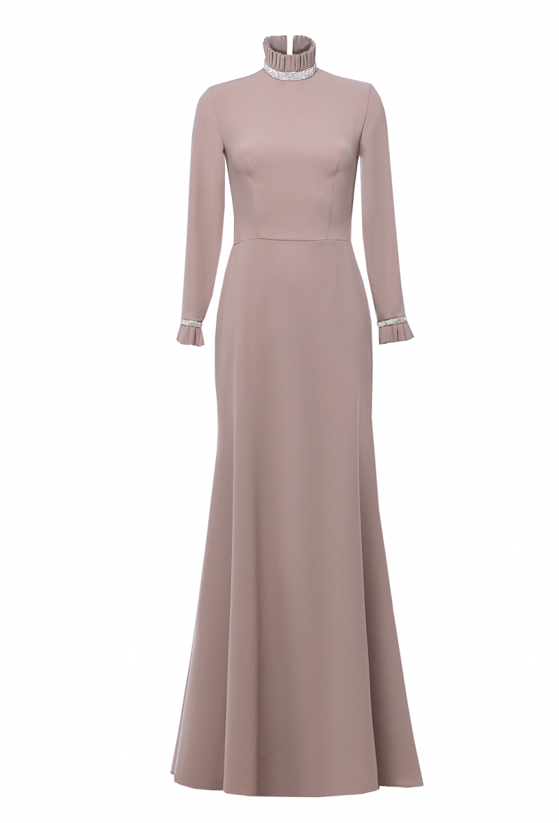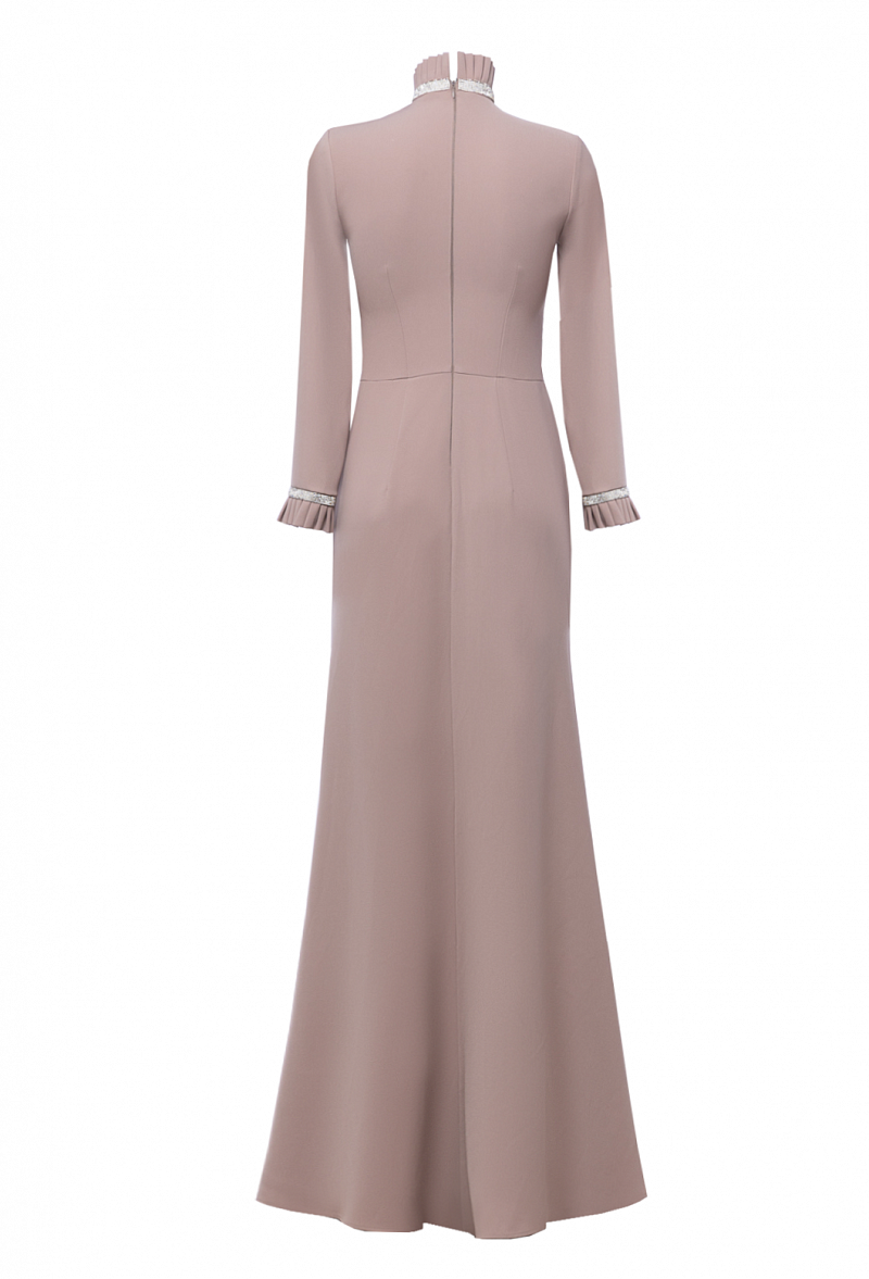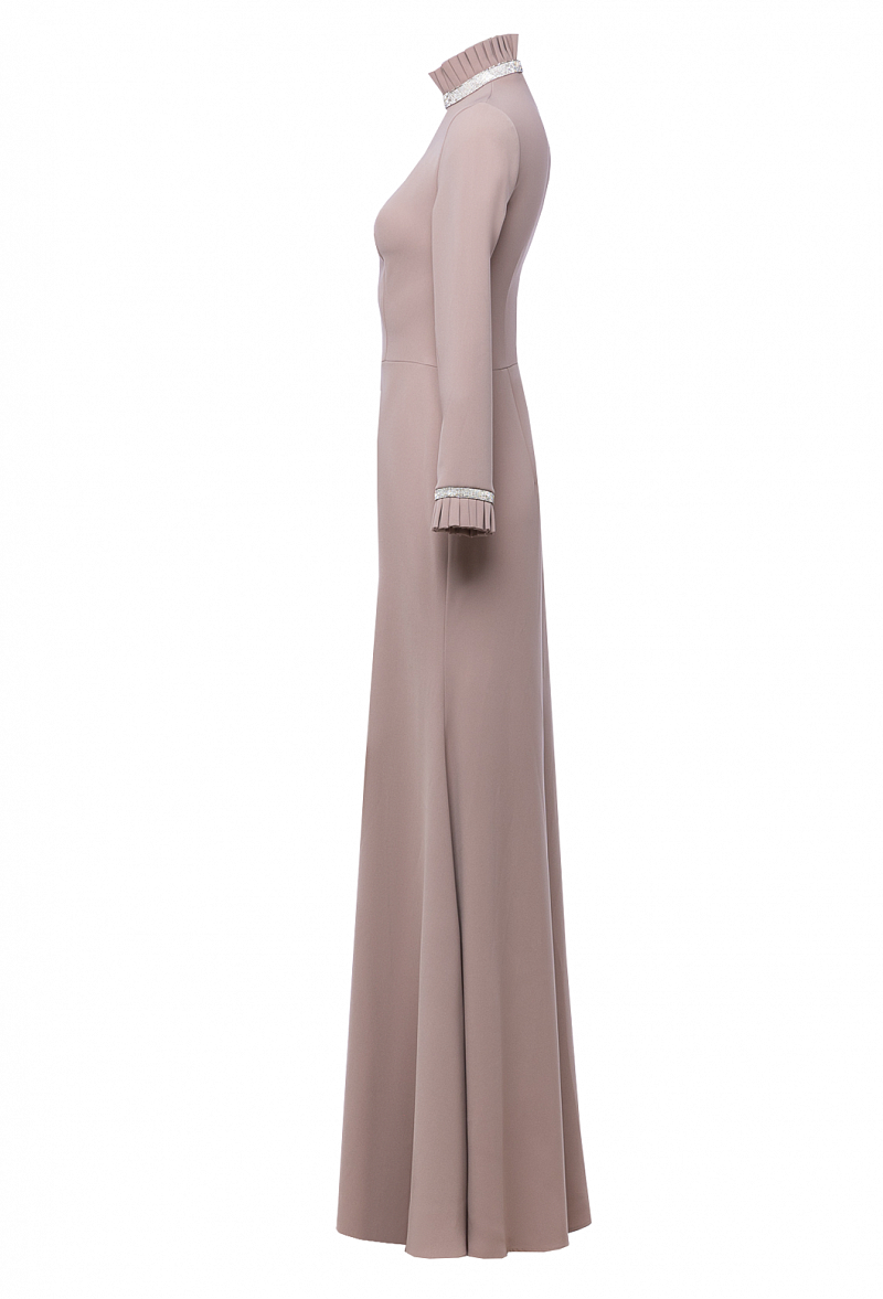 Длинное платье из крепа с отрезной линией талии. Силуэт - рыбка. Воротник-стойка и манжеты в складку оторочены стразами Сваровски.