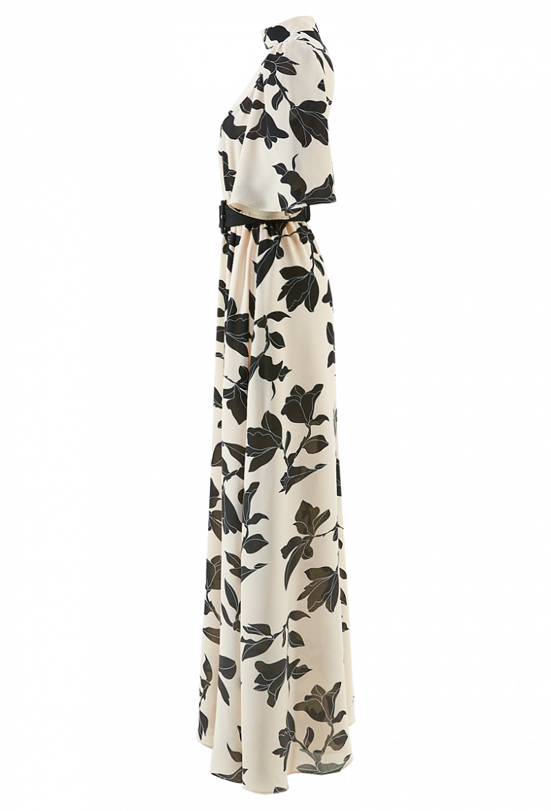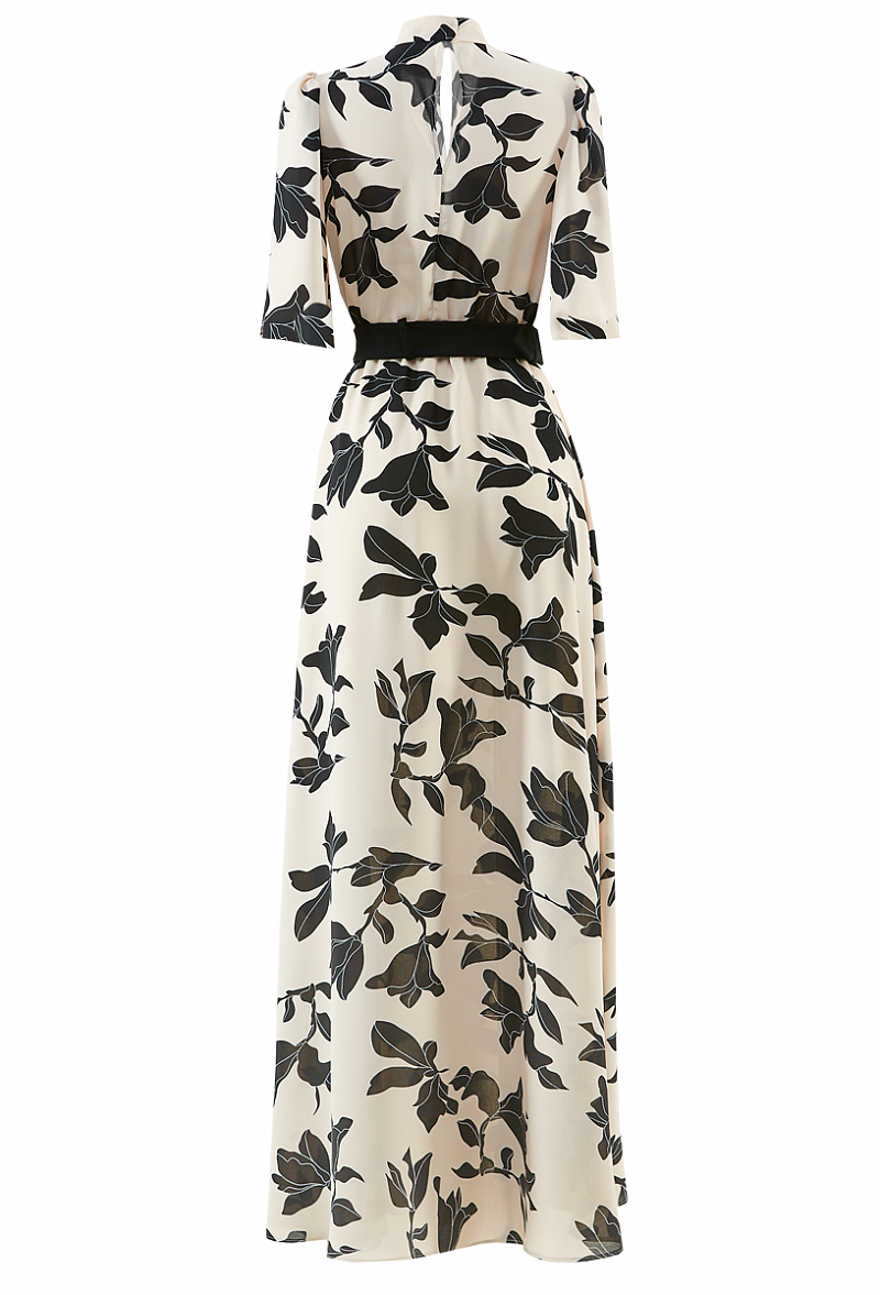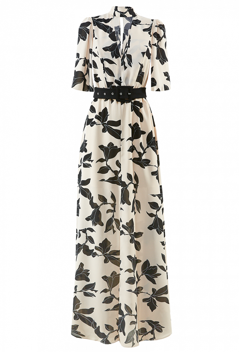 Длинное платье с разрезом и с поясом. Силуэт - трапеция. С V-образным вырезом и воротником стойка. Цветочный принт.