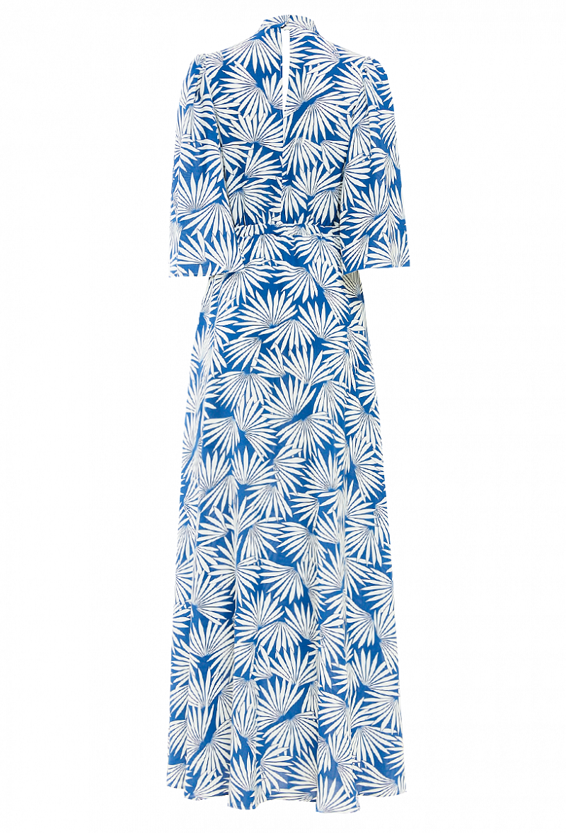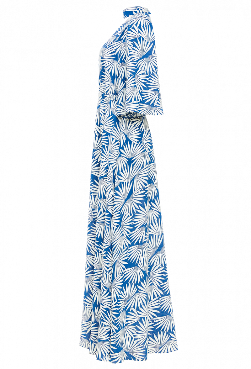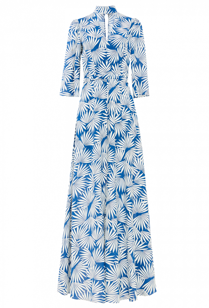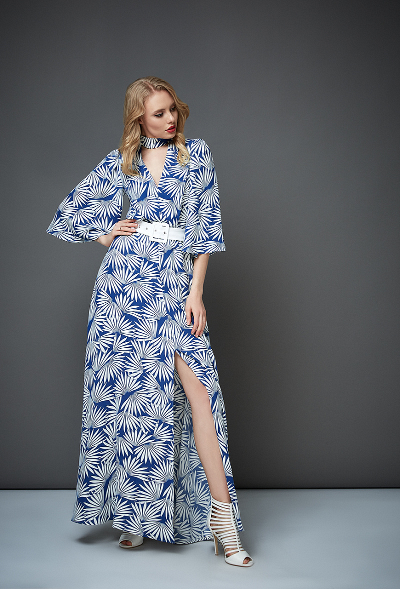 Длинное платье с разрезом и с поясом. Силуэт - трапеция. С V-образным вырезом и воротником стойка. Цветочный принт.