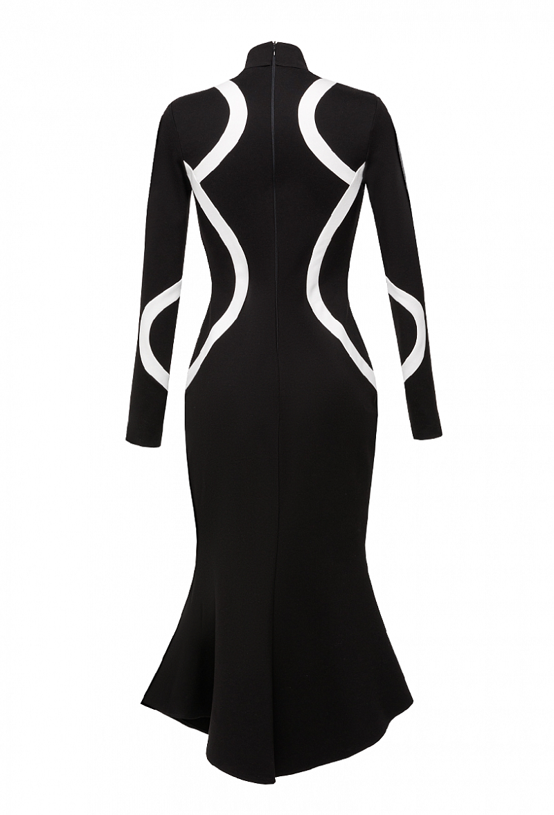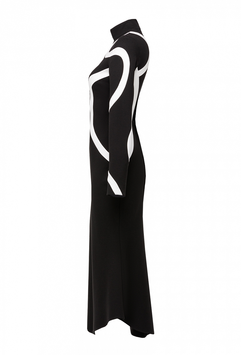Трикотажное платье с длинным рукавом силуэта годе. С воротником стойка и графическими вставками.