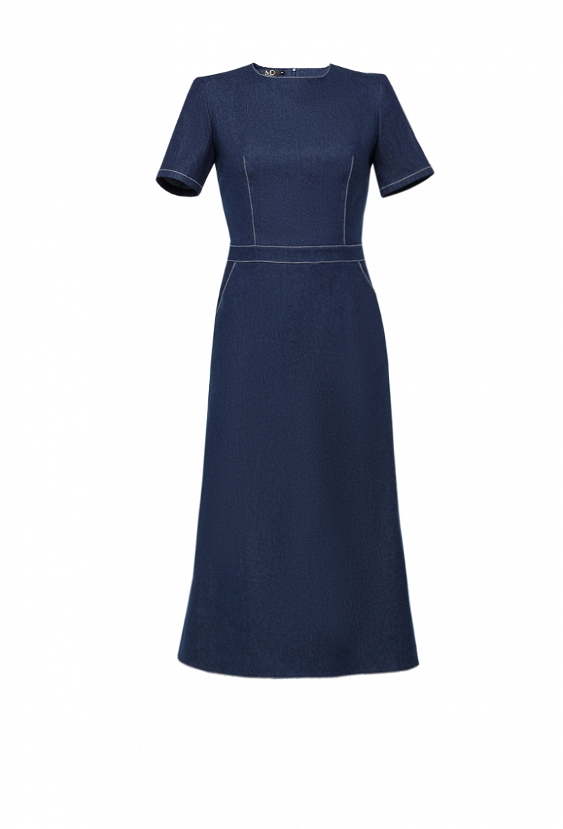 Джинсовое платье с коротким рукавом, с А-образной юбкой и отрезной талией и карманами.