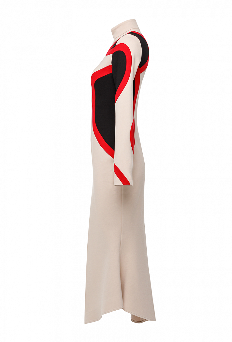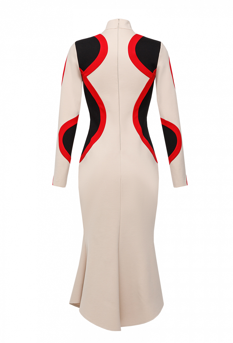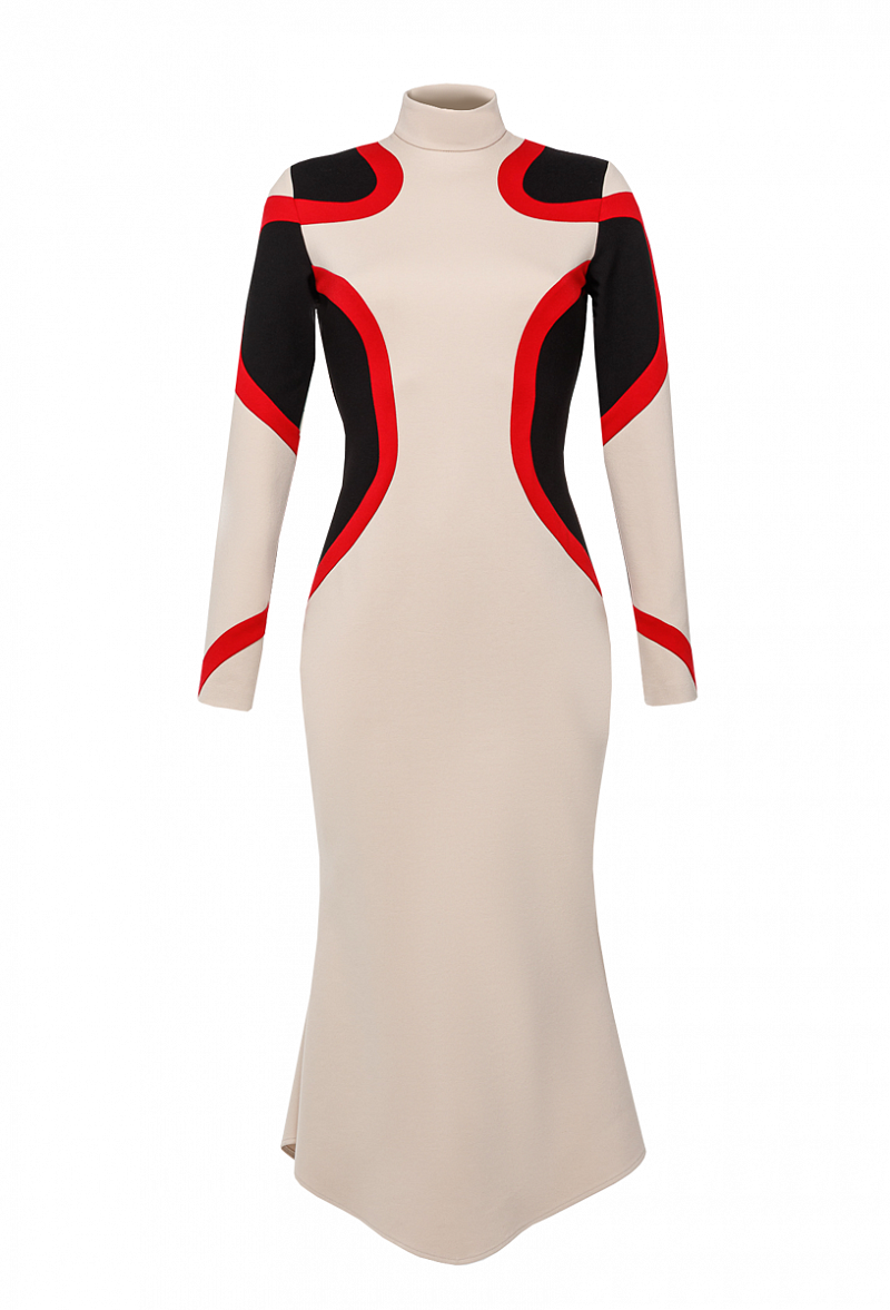 Трикотажное платье силуэта годе с воротником стойка и графическими вставками
