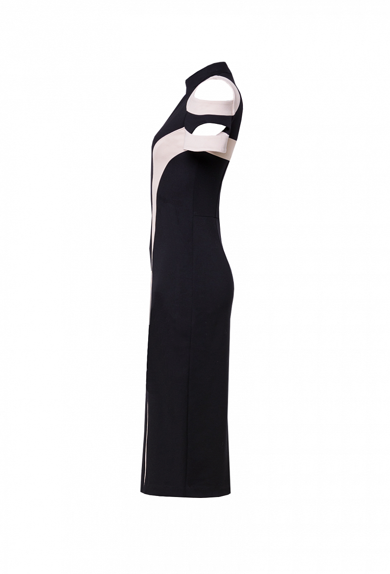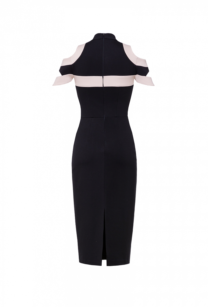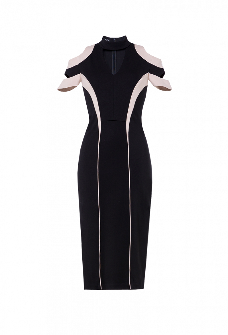 Графическое платье-футляр с рельефными вставками контрастного цвета, V-образным вырезом, отрытые декоративные плечи.