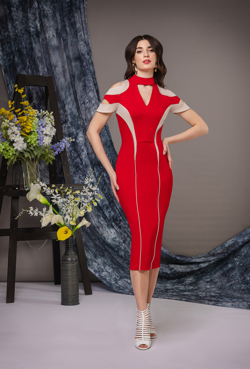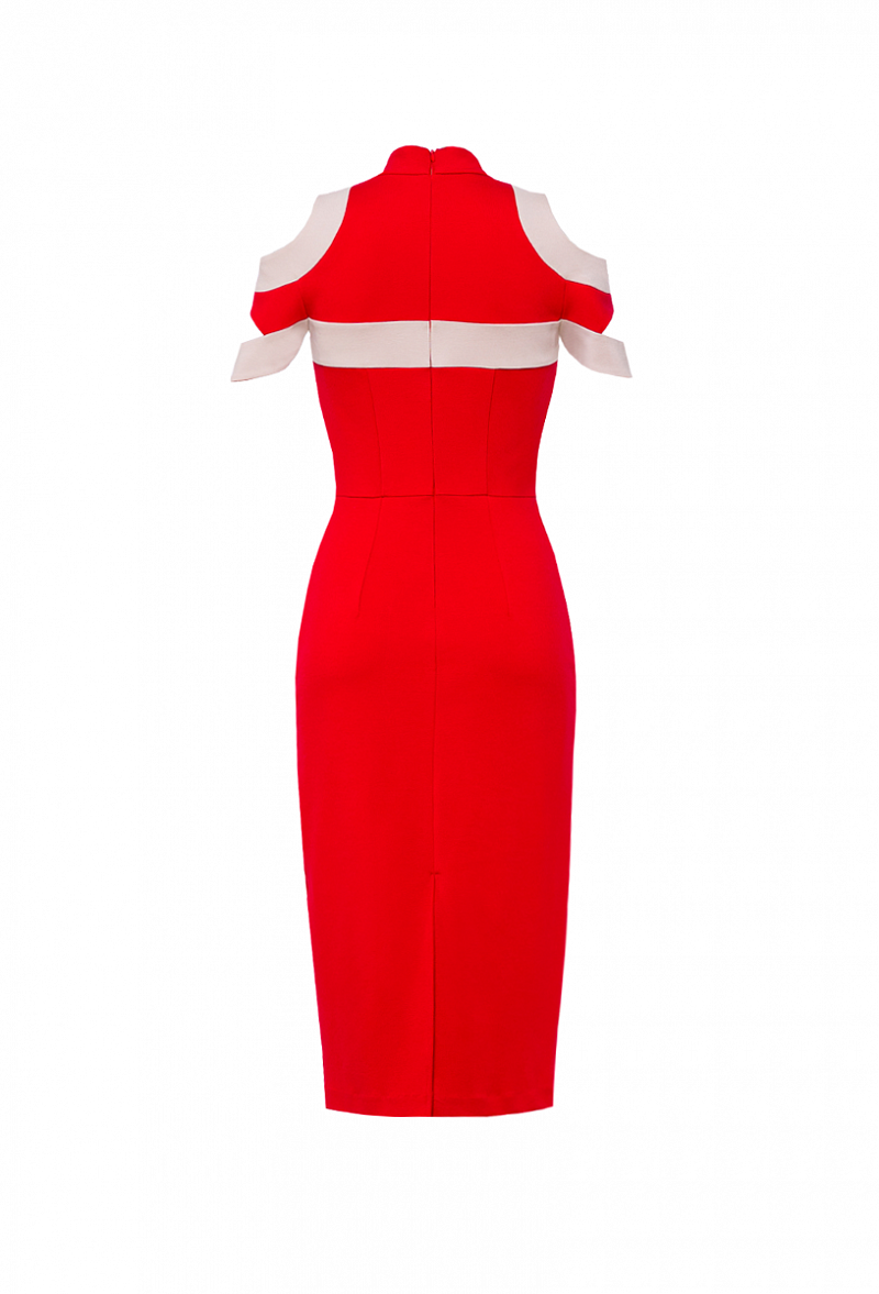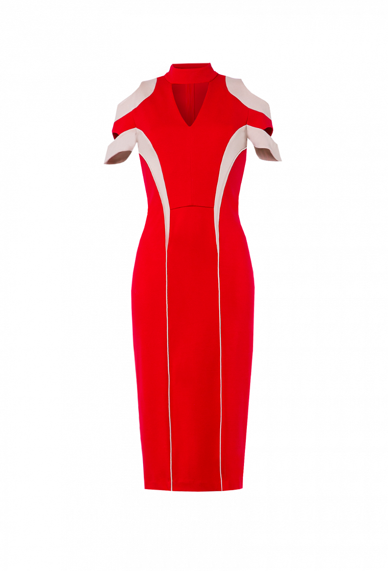 Графическое платье-футляр с рельефными вставками контрастного цвета, V-образным вырезом, отрытые декоративные плечи.