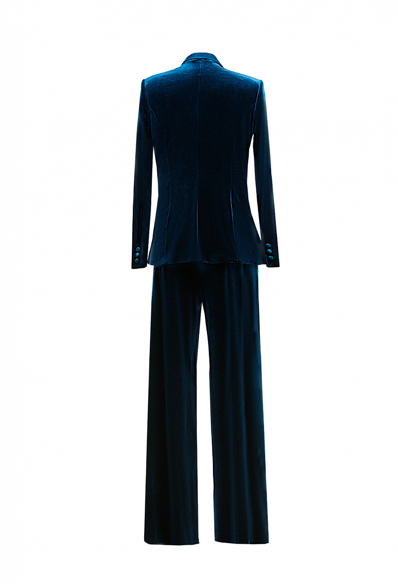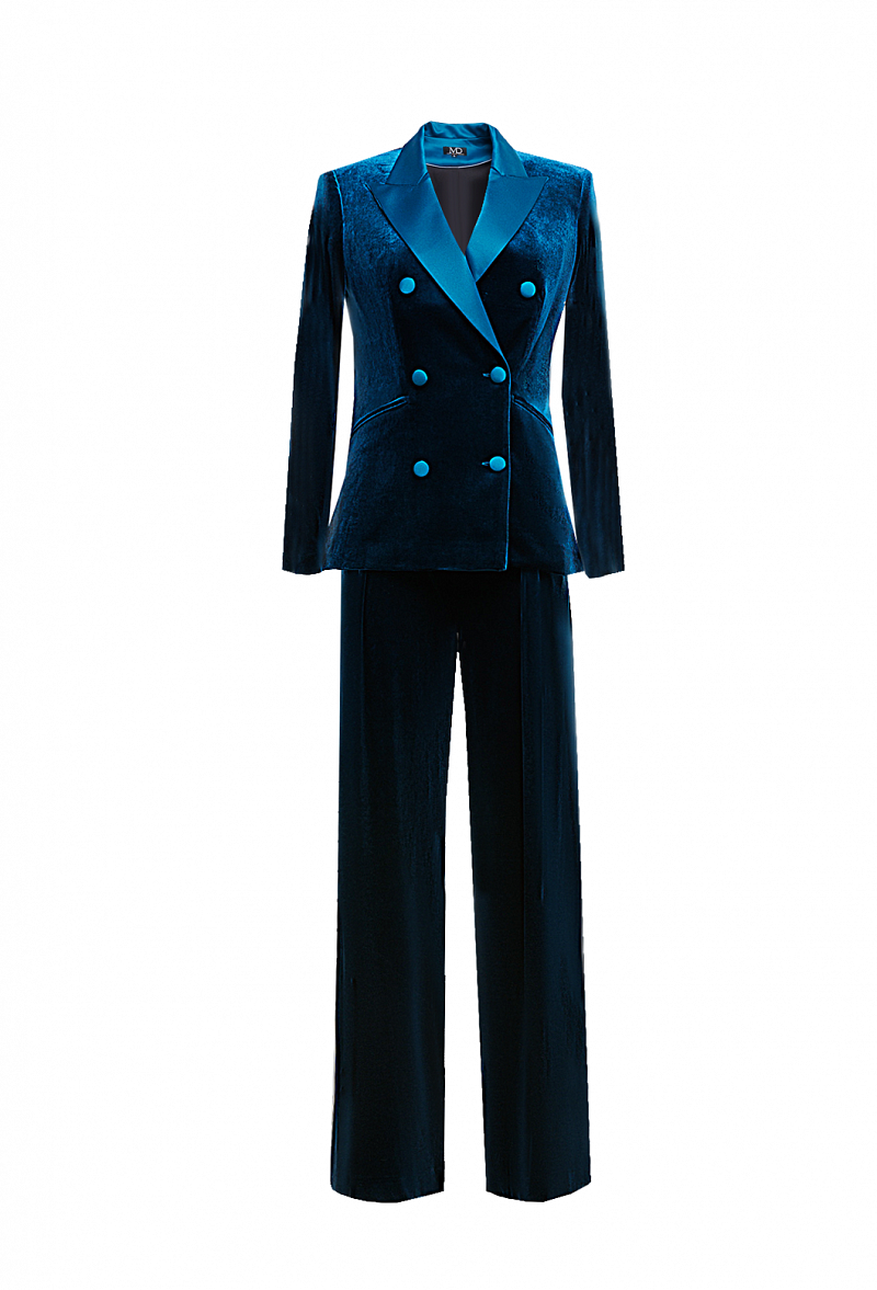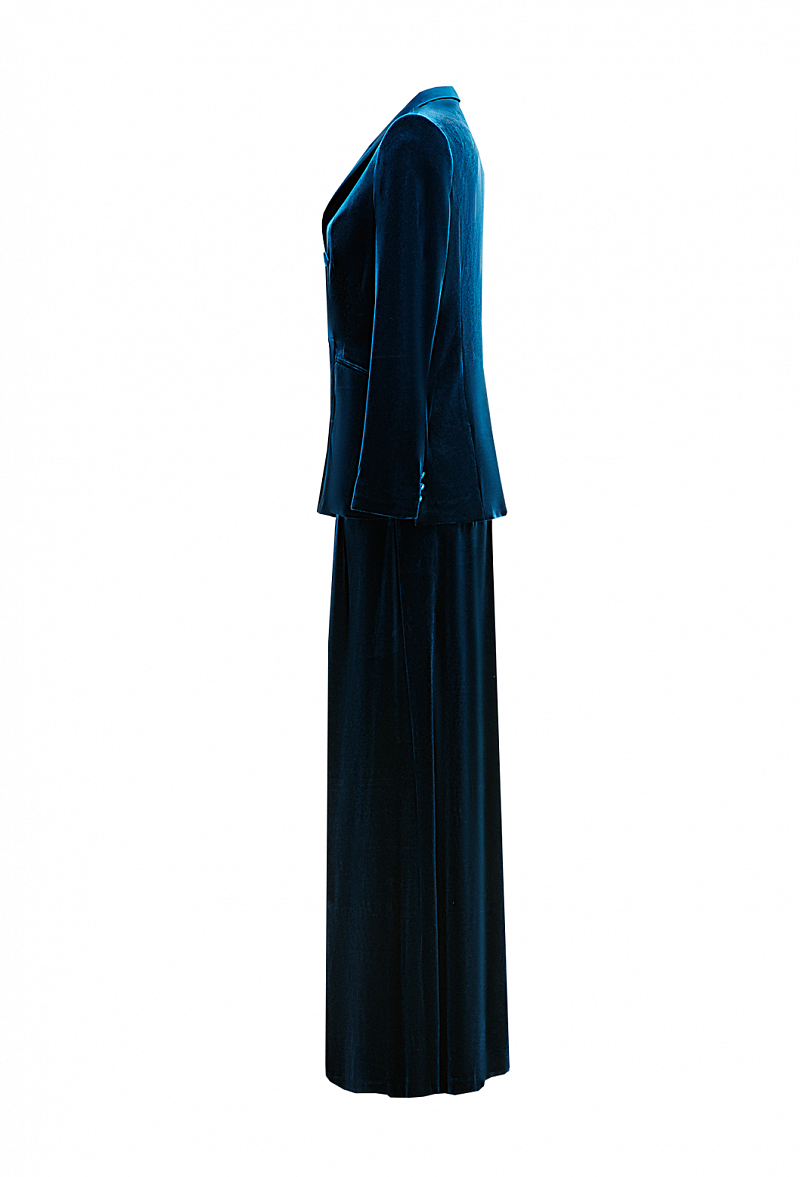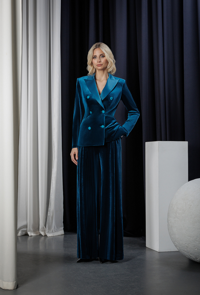 Брючный костюм: пиджак приталенный двубортный, брюки-палаццо.