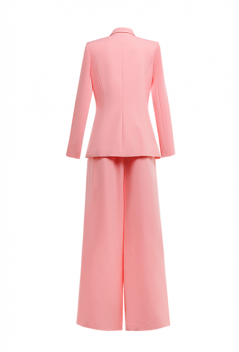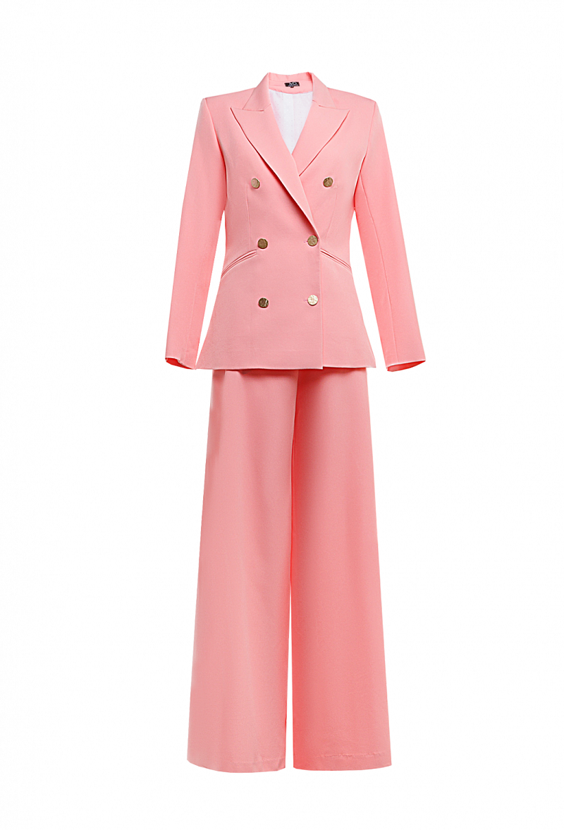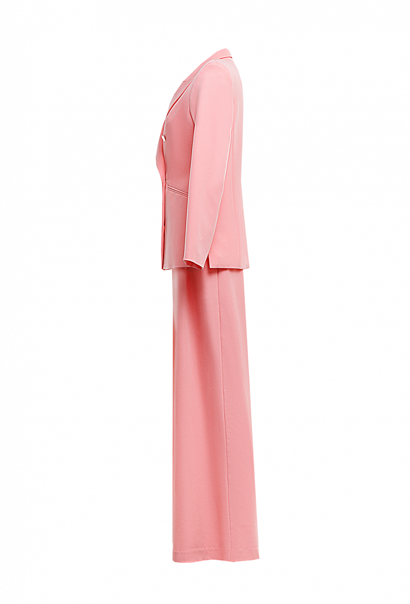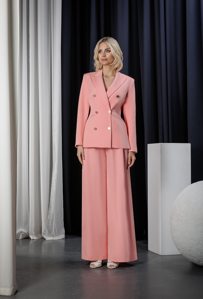 Костюм брючный розовый. Пиджак двубортный, английский воротник, карман рамка. Брюки палаццо.