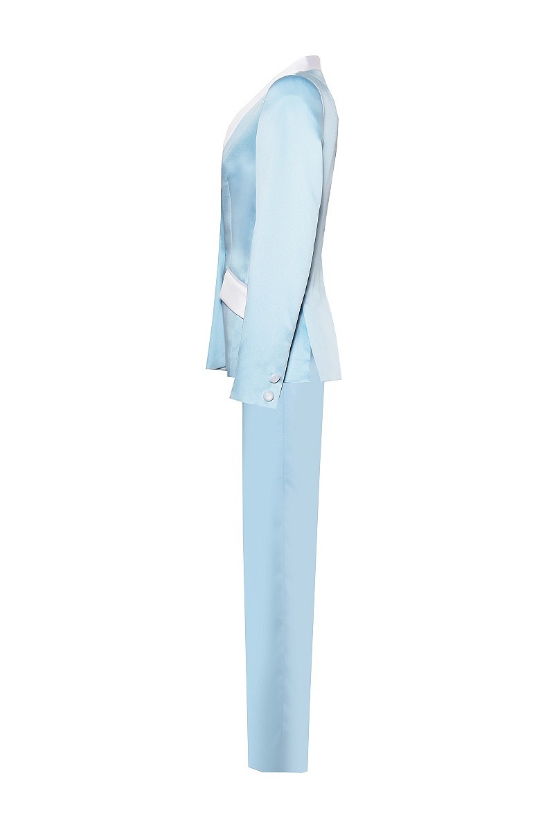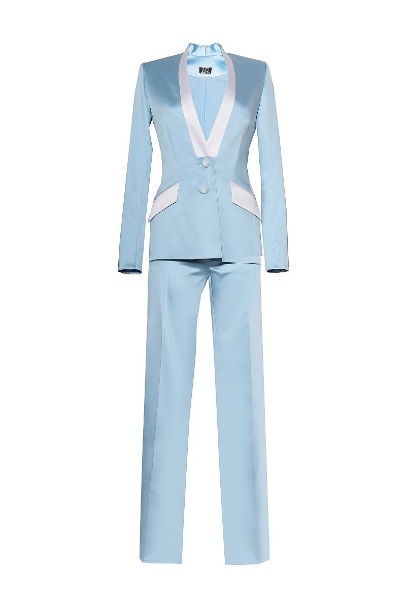 Костюм однобортный. Пиджак с белым воротником и клапанами. Брюки зауженные к низу.