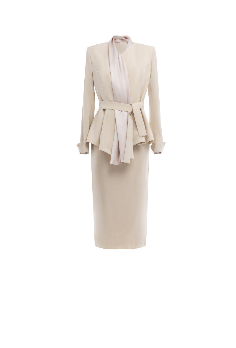 Пиджак с декоративной отделкой бежевый, юбка-карандаш
