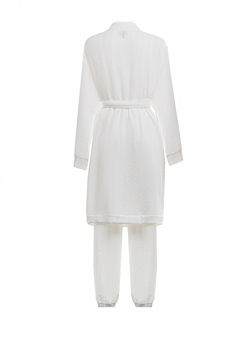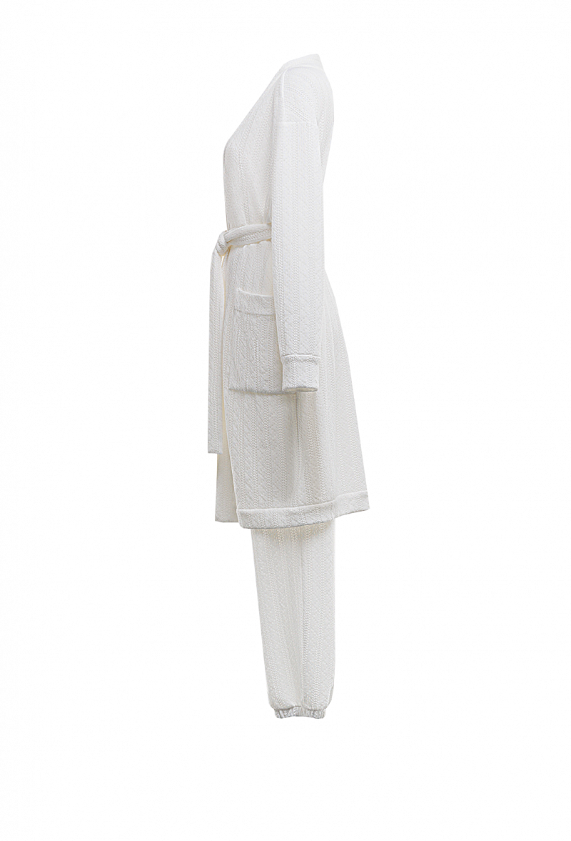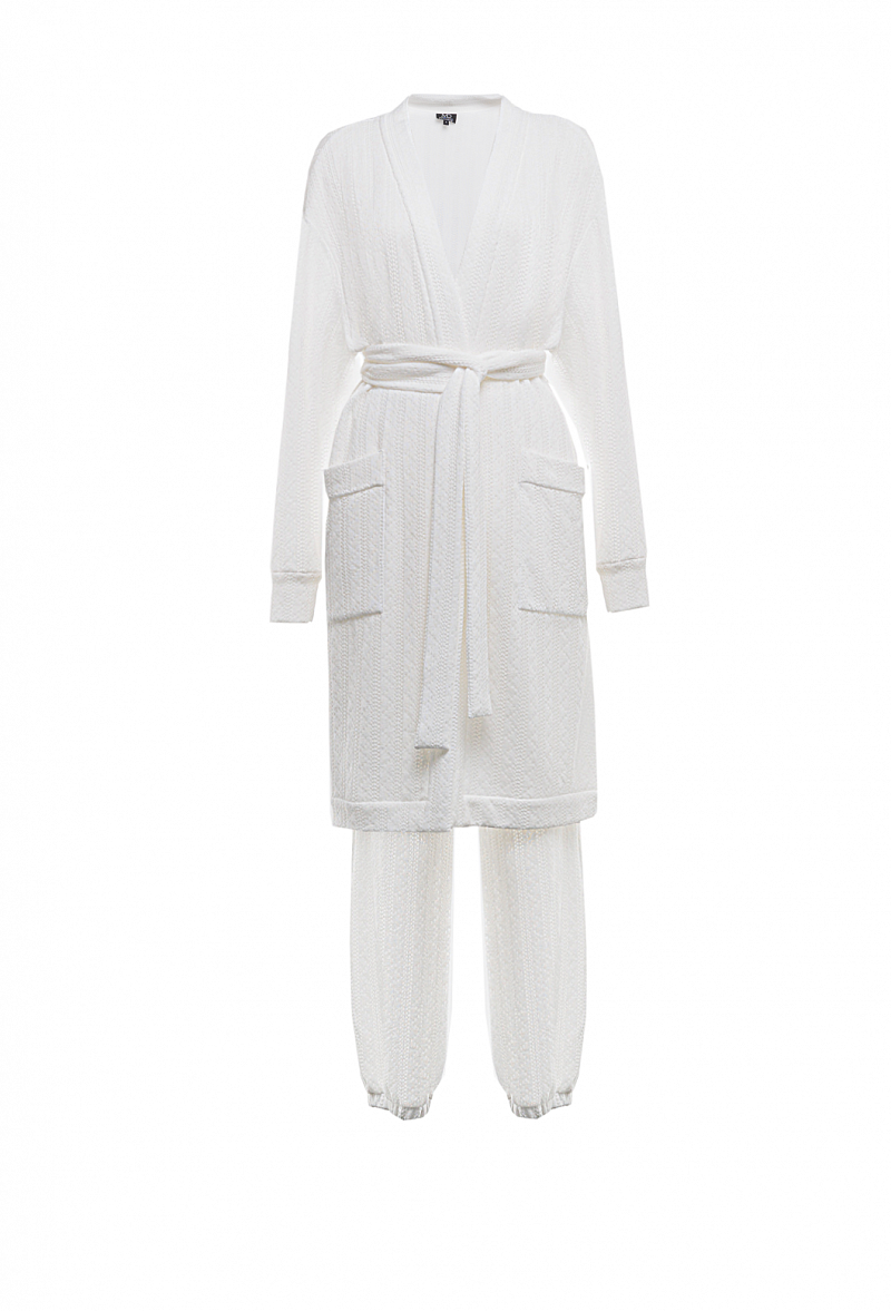Костюм брючный из ажурного трикотажа. Брюки на поясе и снизу на резинке. Длинный кардиган с планкой, без пуговиц, с поясом и накладными карманами.