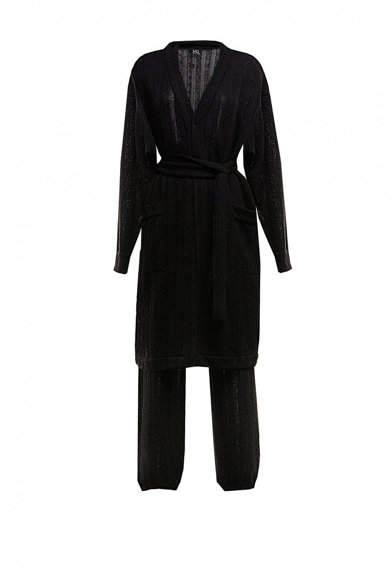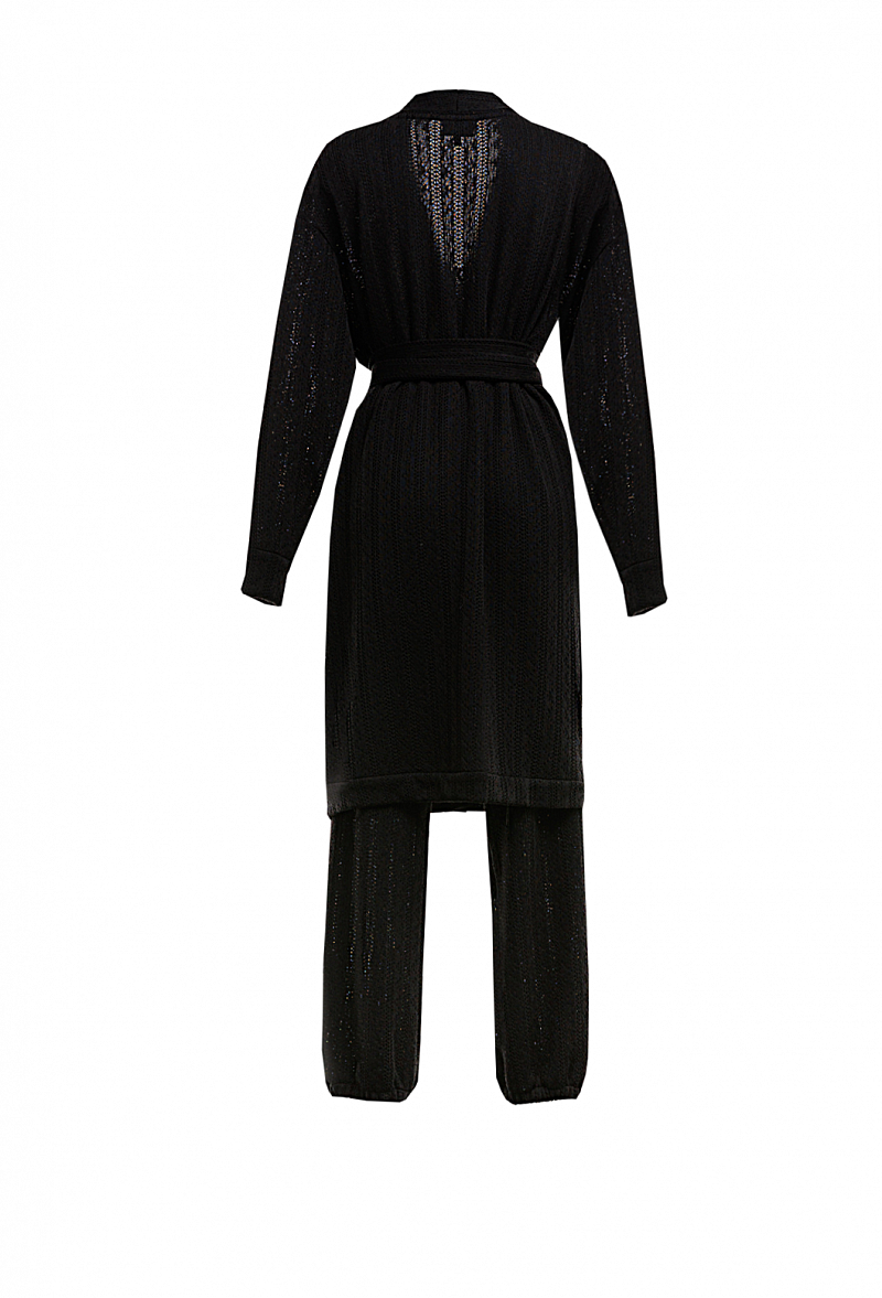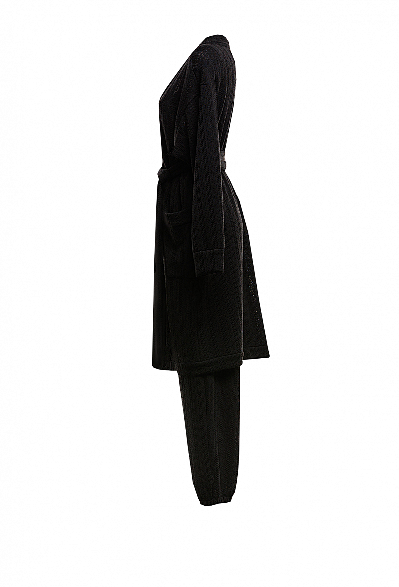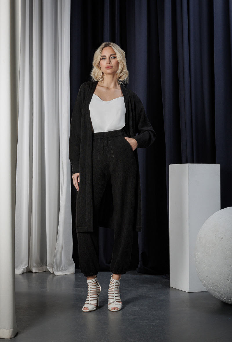 Костюм брючный из ажурного трикотажа. Брюки на поясе и снизу на резинке. Длинный кардиган с планкой, без пуговиц, с поясом и накладными карманами.