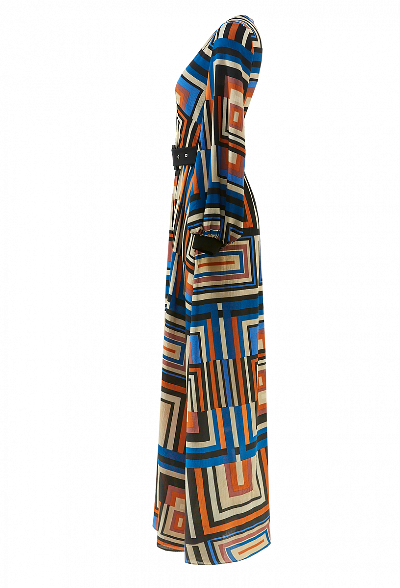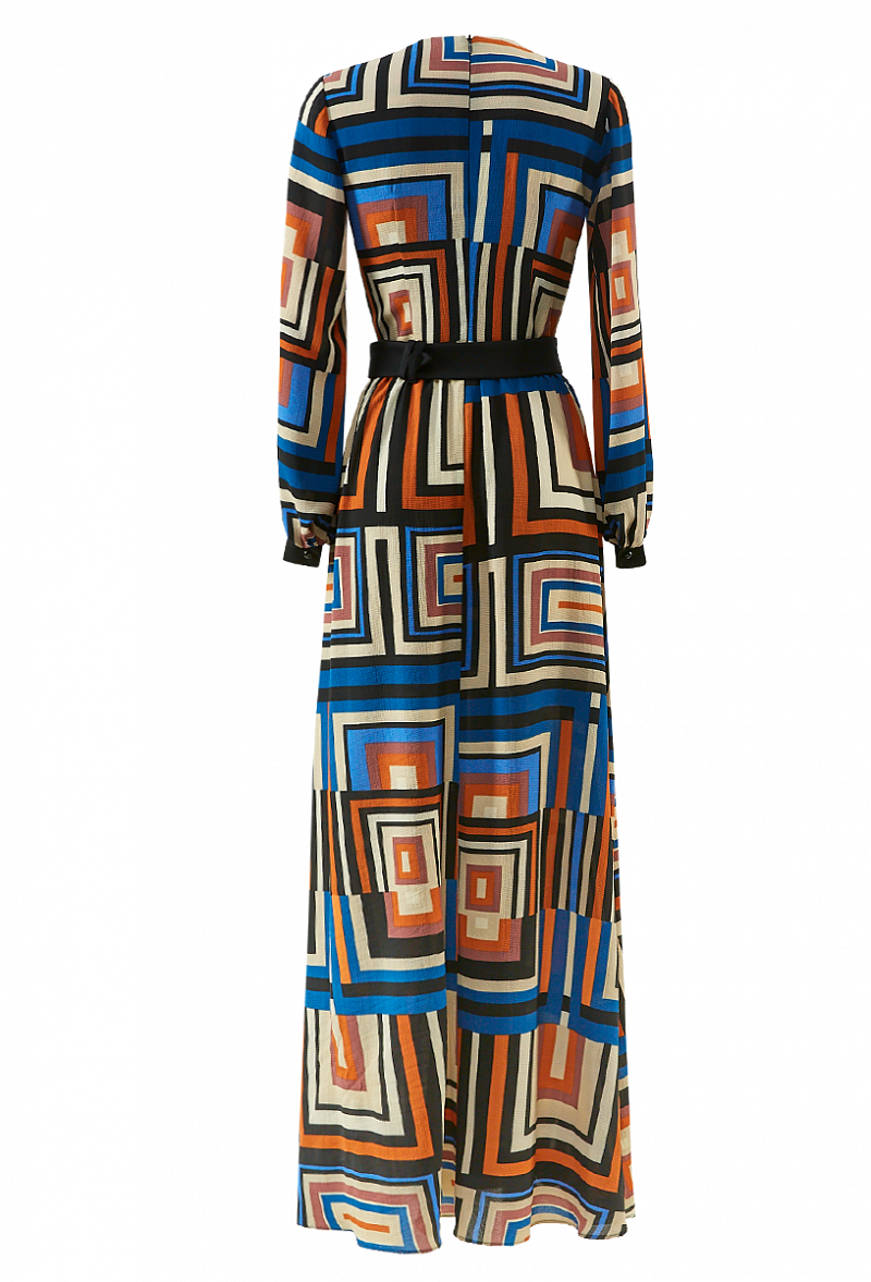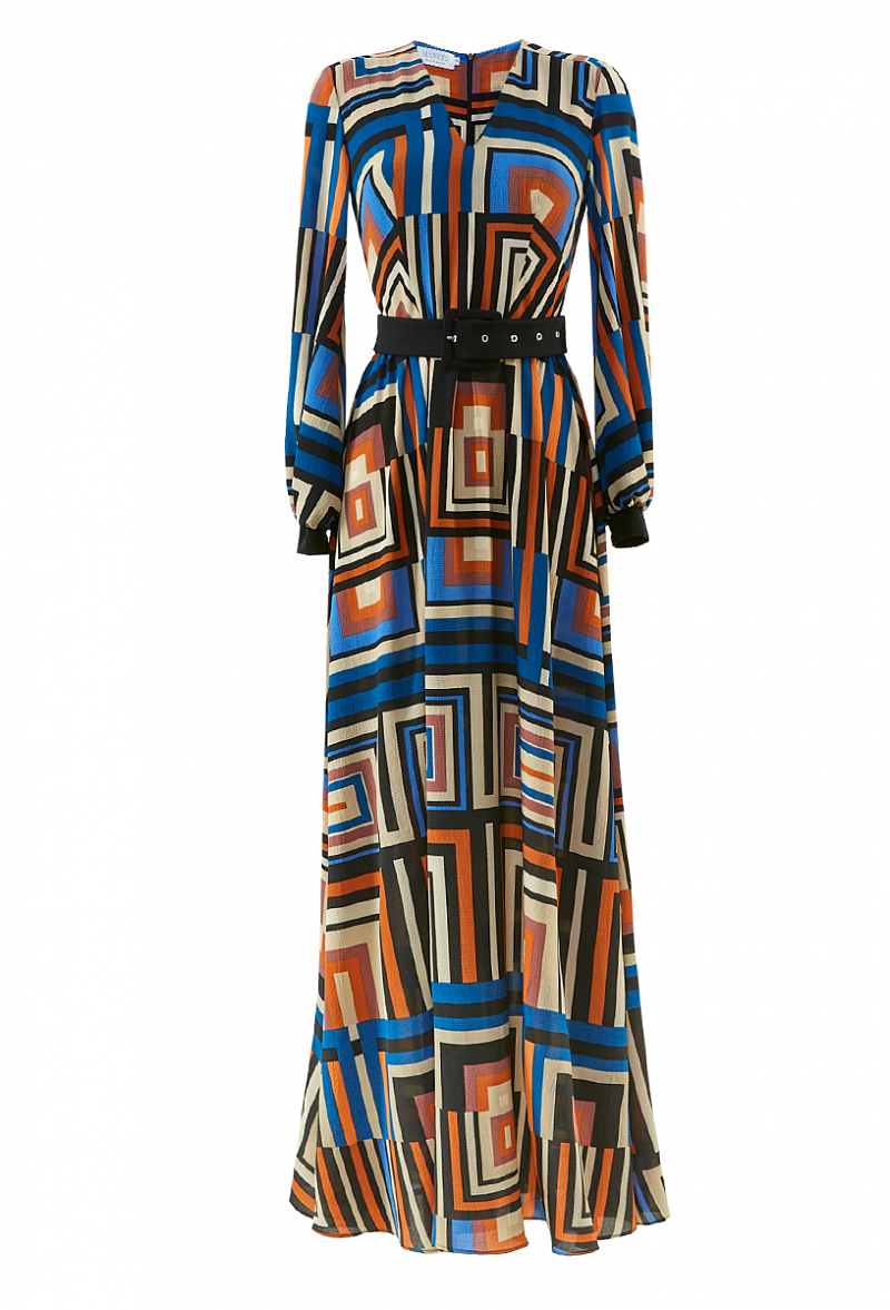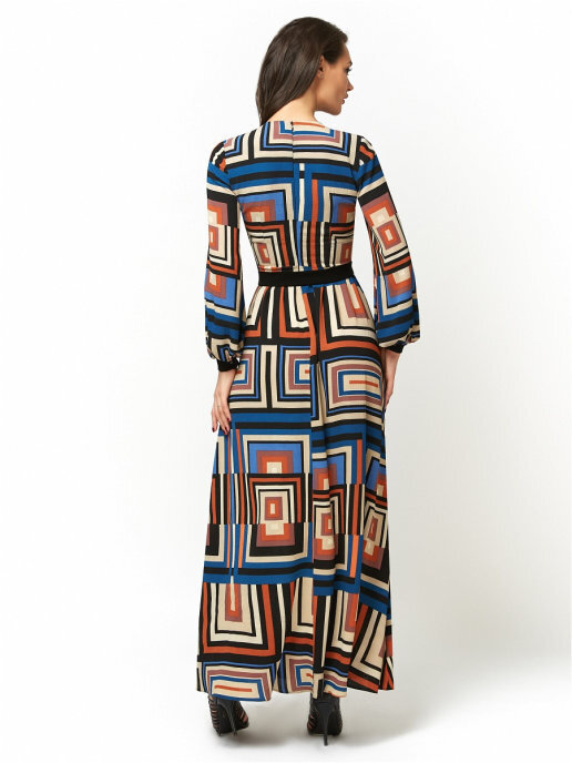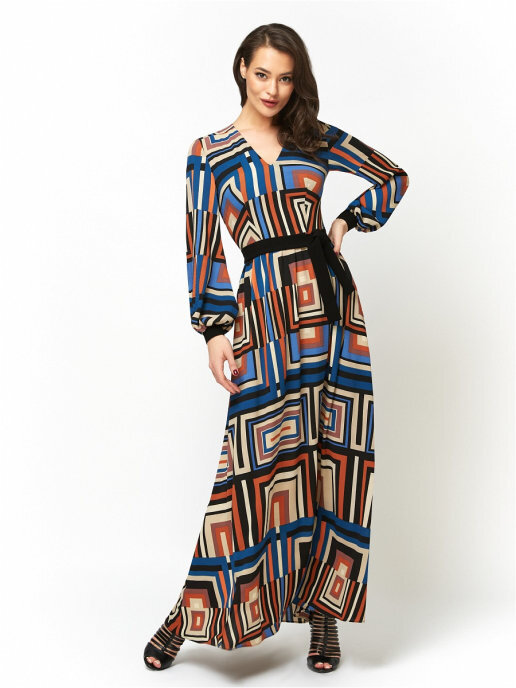 Креповое платье с длинной юбкой - трапеция, с длинным рукавом. С V-образным вырезом горловины. Принт - геометрия.