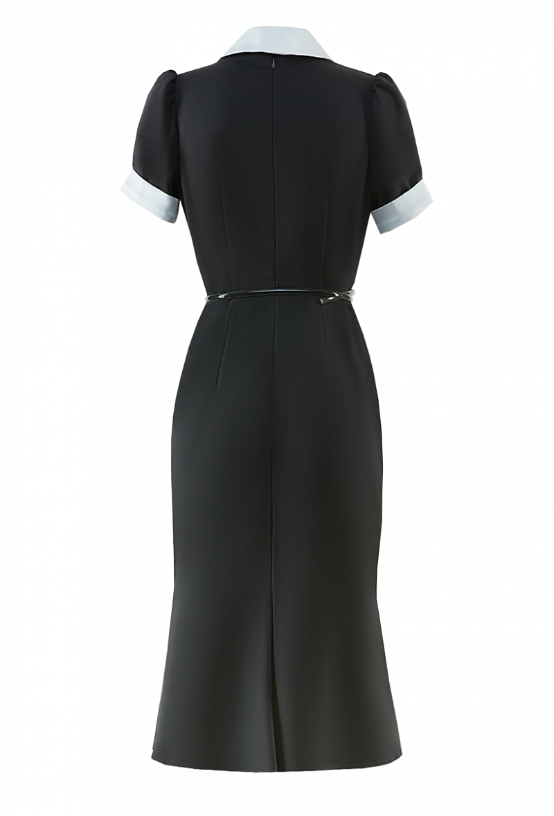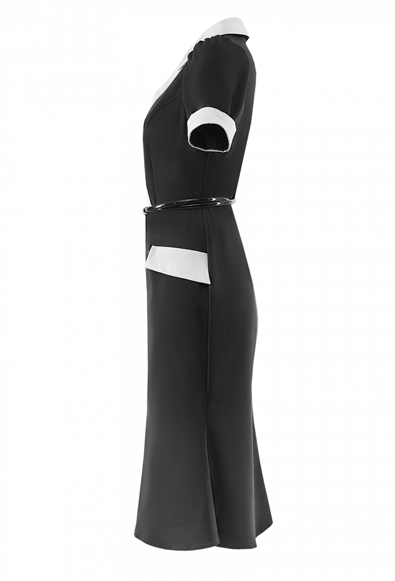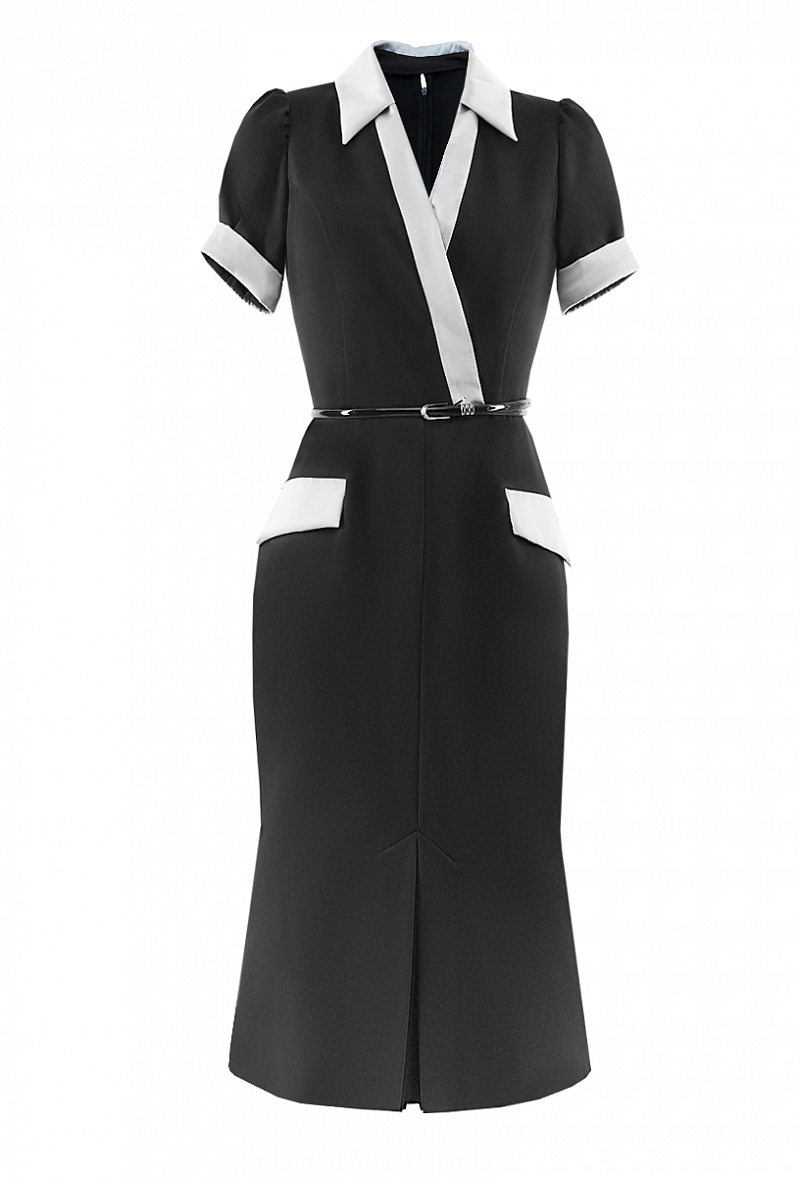 Креповое платье с коротким рукавом, с шелковыми вставками и карманами - клапанами. Отложной воротничок. Юбка со складкой.