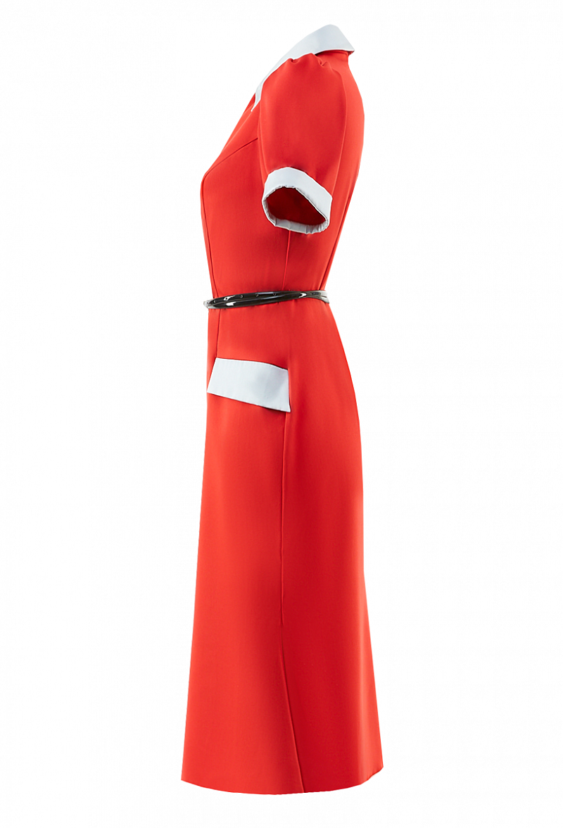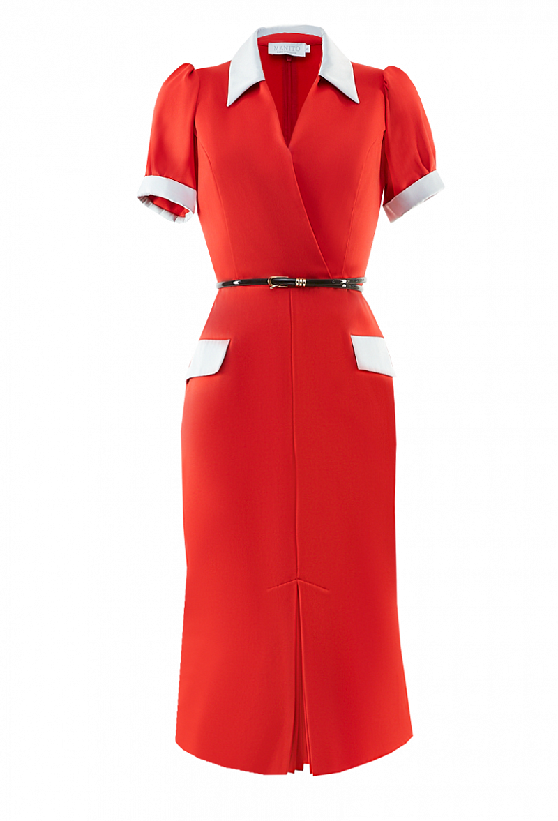 Креповое платье с коротким рукавом, с шелковыми вставками и карманами - клапанами. Отложной воротничок. Юбка со складкой.