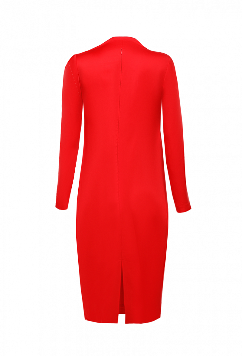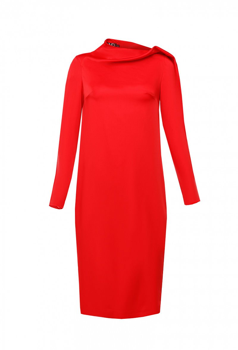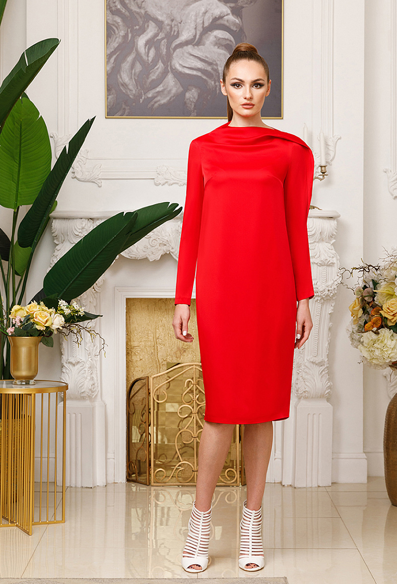 Креповое прямое платье с воротником с защипом, переходящим на рукав.
