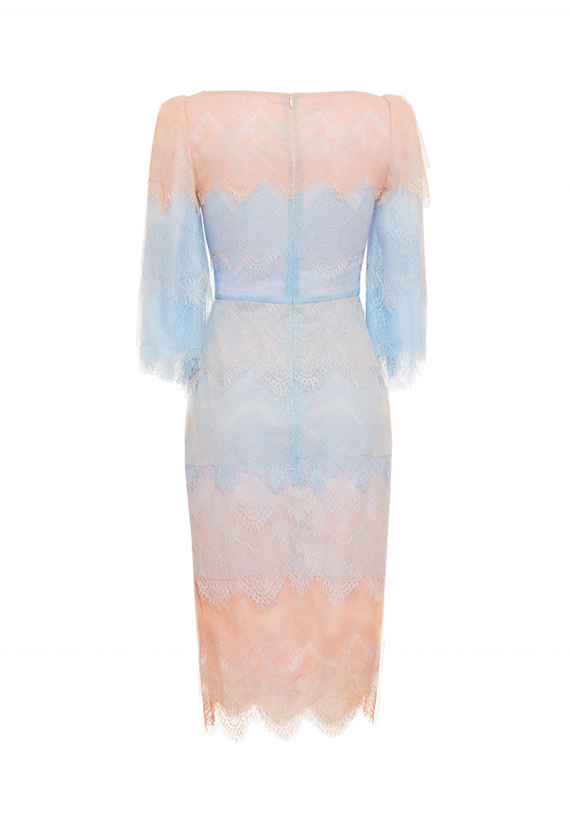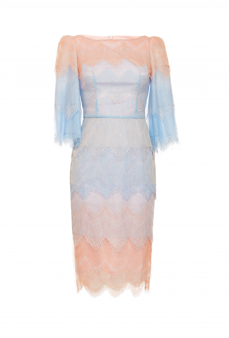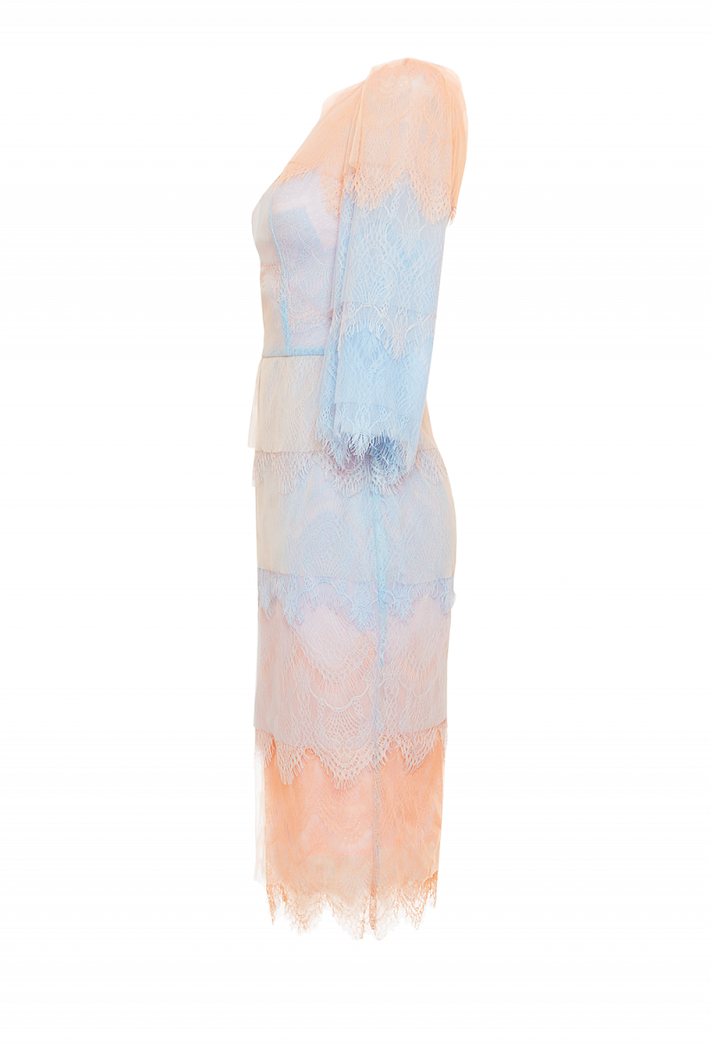 Кружевное платье-футляр. Нежное кружево настрочено вручную каскадом на фатин. Наружный слой фатина на кружеве для создания эффекта "туманности", кружевной рукав колокол, юбка карандаш с разрезом сзади, длина юбки 70 см.