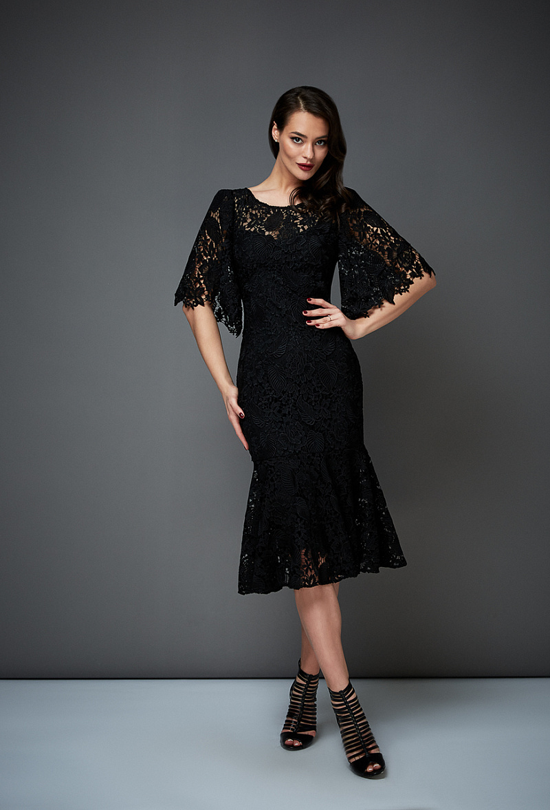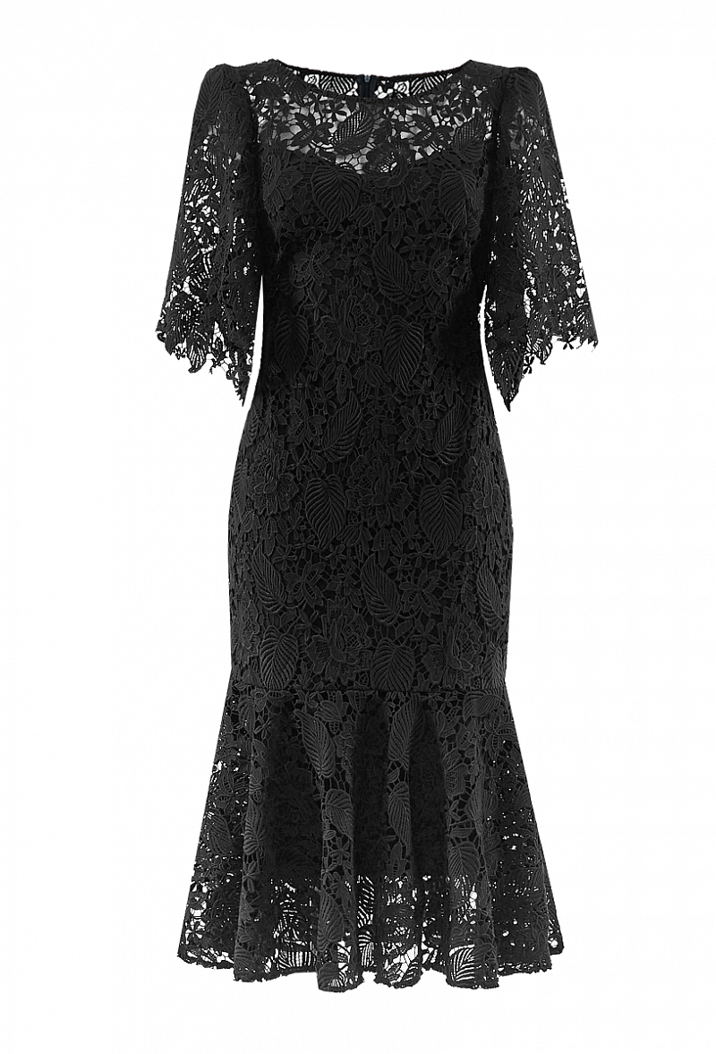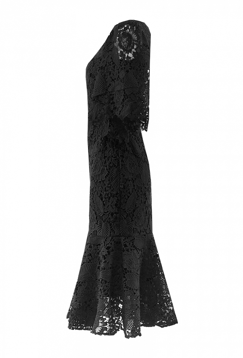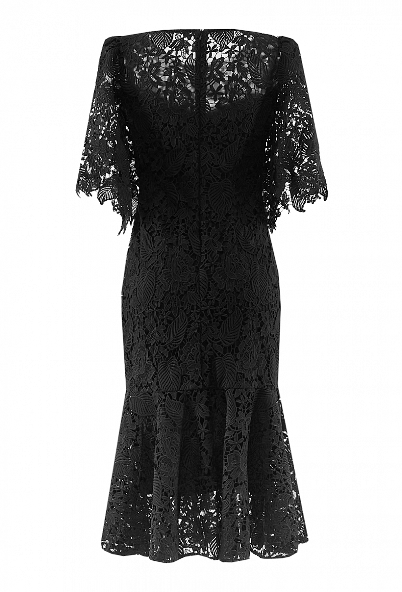 Кружевное платье - футляр с подкладом, с широким рукавом. С отрезной юбкой - волан. С V-образным вырезом по спинке.