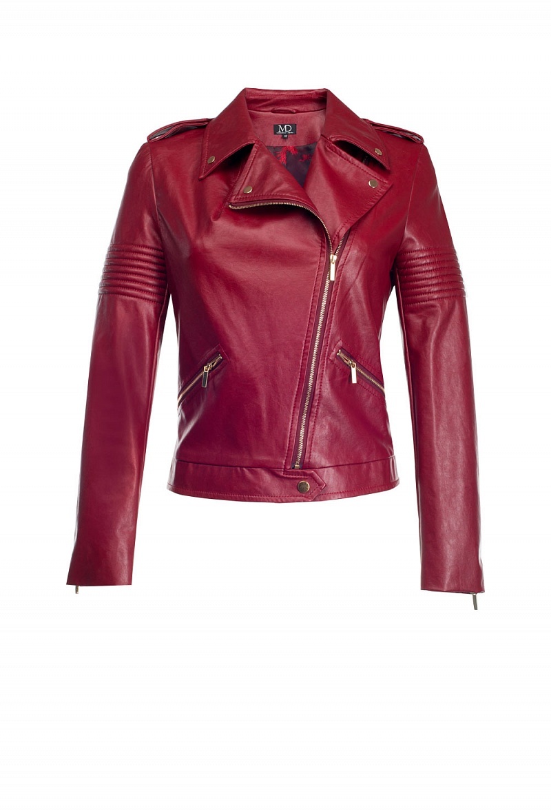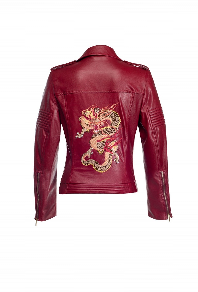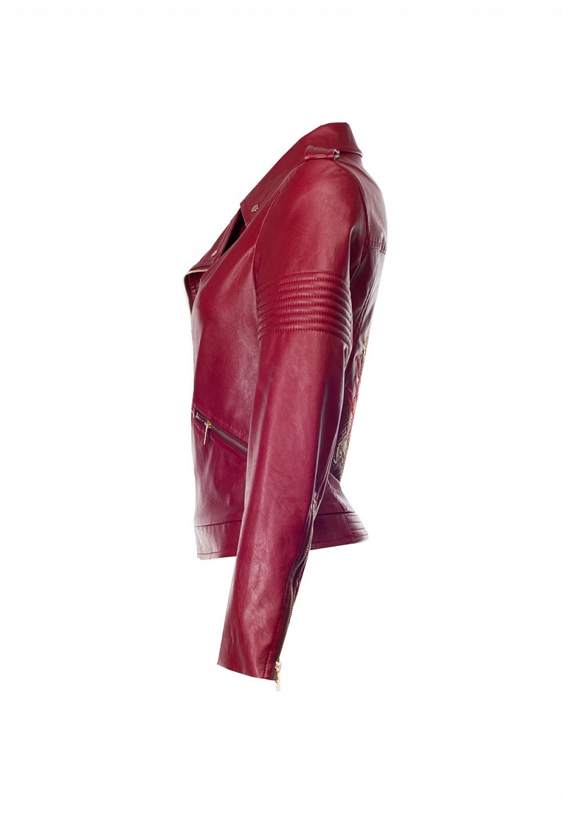 Приталенная куртка-косуха из экокожи, закрывающаяся на молнию. На спинке- авторская вышивка.На плечах погоны. Куртка декорирована кнопками, на рукавах молнии.