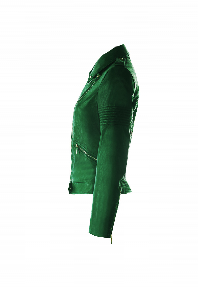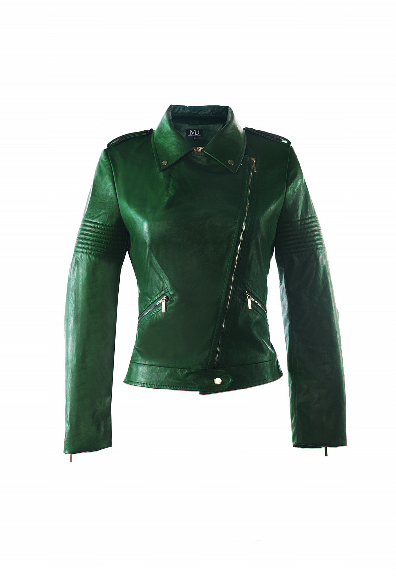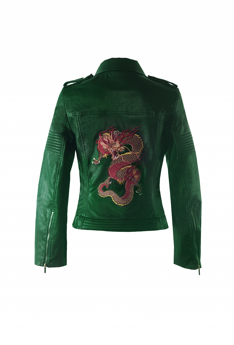 Приталенная куртка-косуха из экокожи, закрывающаяся на молнию. На спинке- авторская вышивка. На плечах-погоны.Куртка декорирована кнопками, на рукавах молнии.