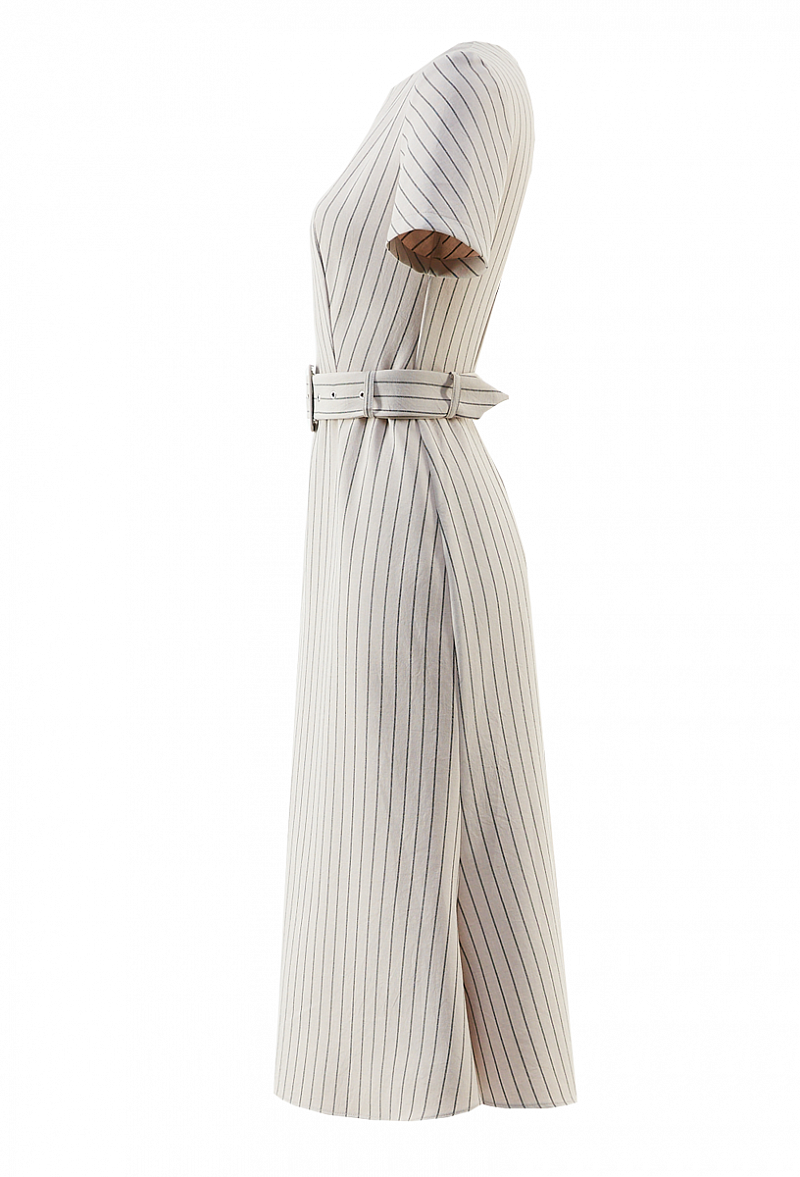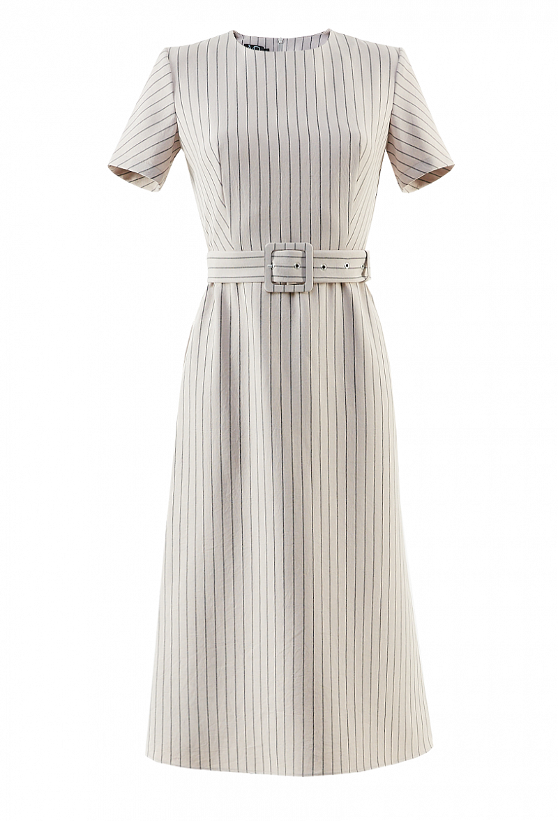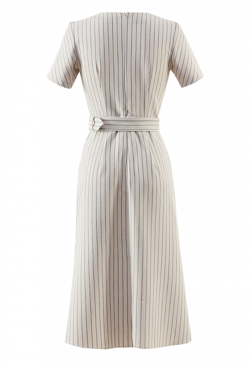 Льняное платье с поясом и коротким рукавом. Юбка - трапеция. Принт - полоска.