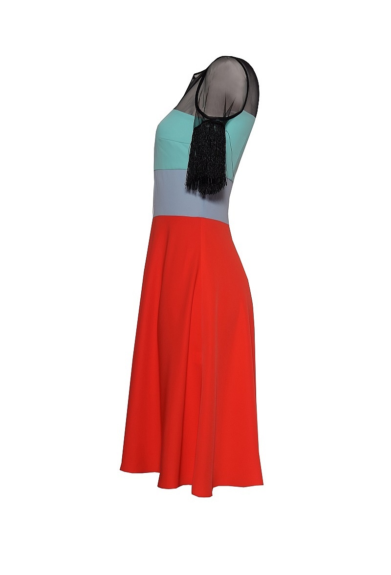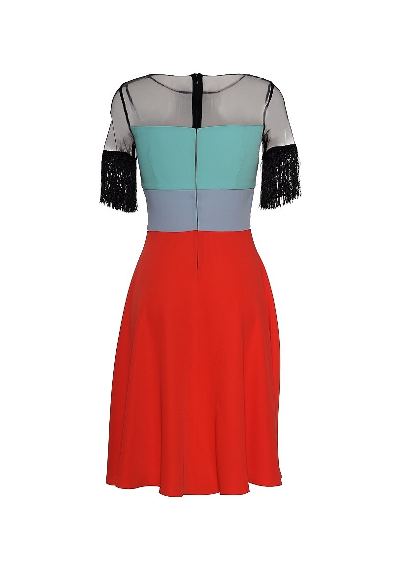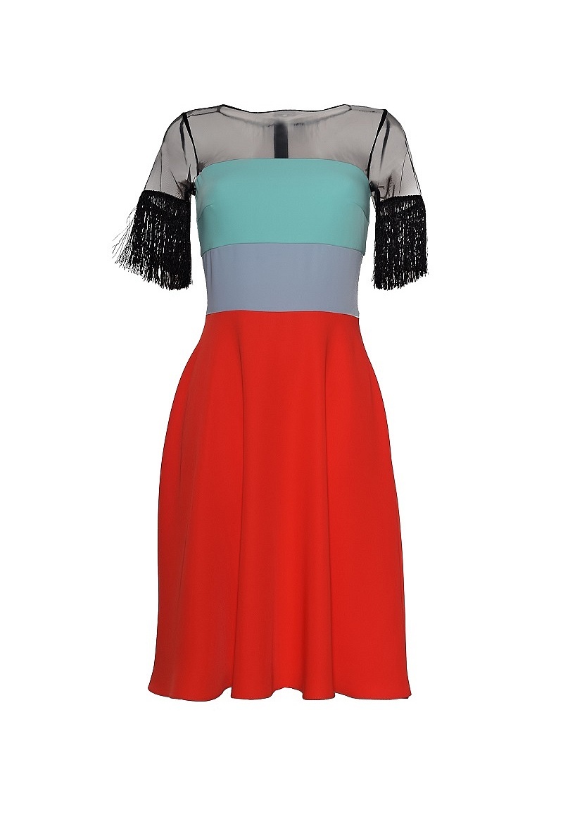Многоцветное платье с юбкой трапеция, кокеткой и коротким рукавом из сетки. Рукава обработаны бахромой.