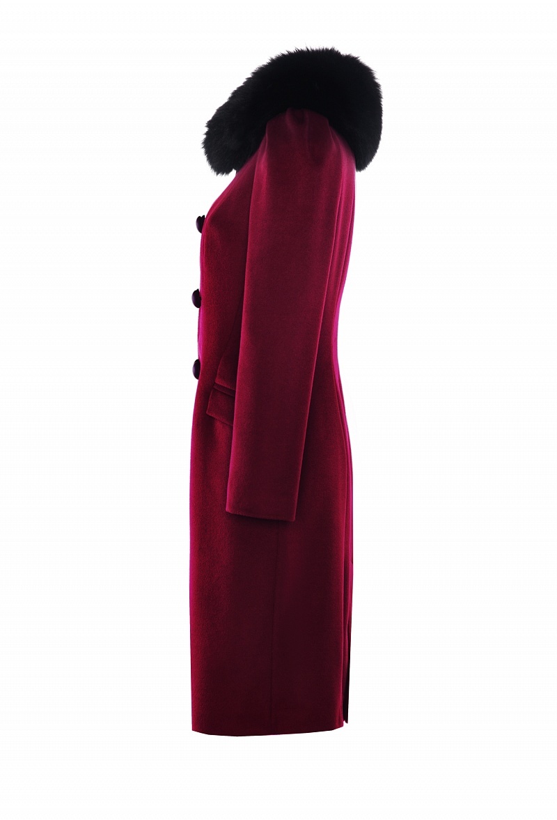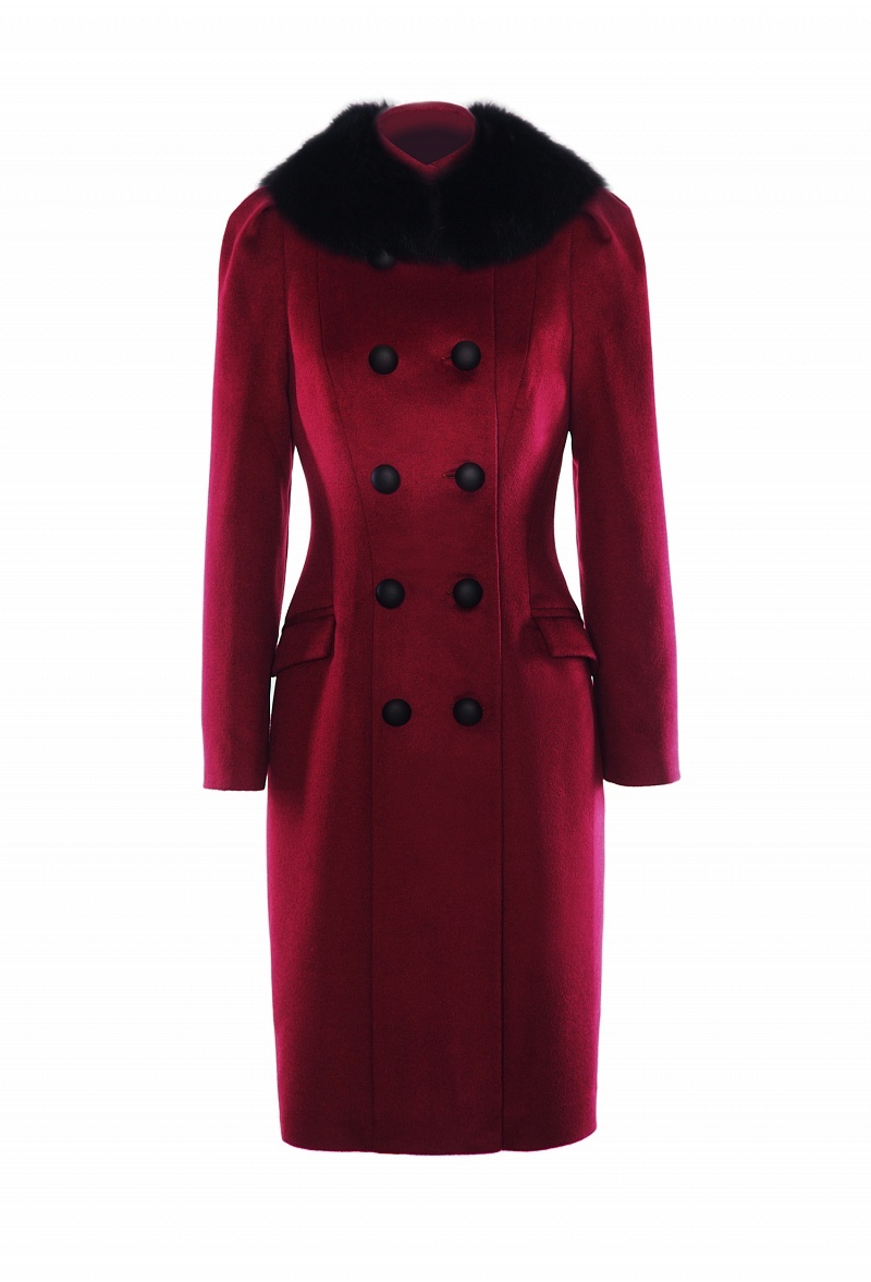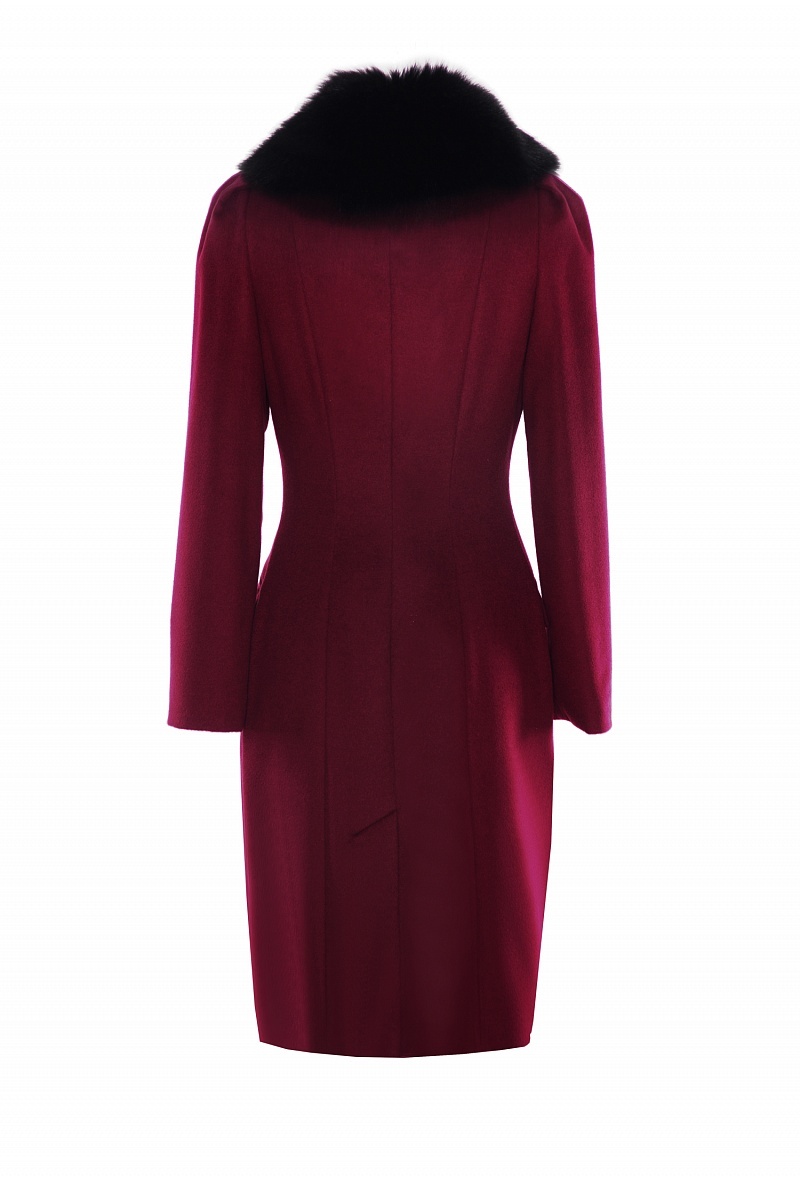 Приталенное двубортное пальто со съемным воротником из песца. Длина до колена. Пальто декорировано съемным воротником из песца и крупными пуговицами.