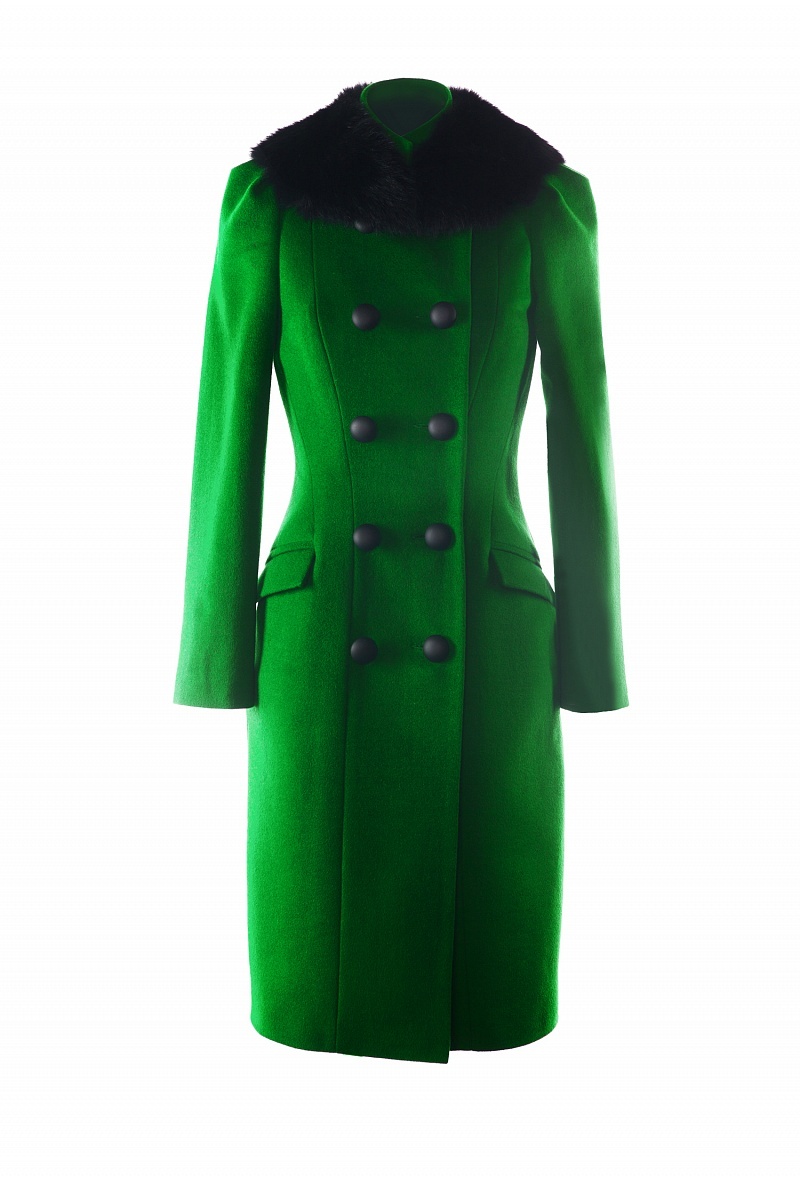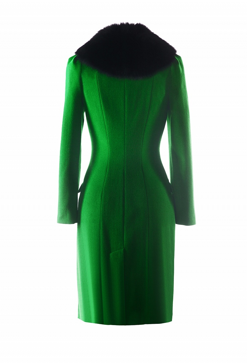 Приталенное двубортное пальто со съемным воротником из песца. Длина до колена. Пальто декорировано съемным воротником из песца и крупными пуговицами.