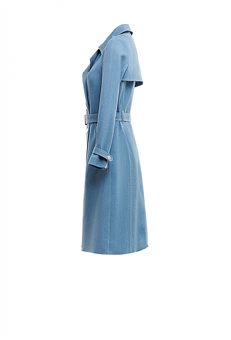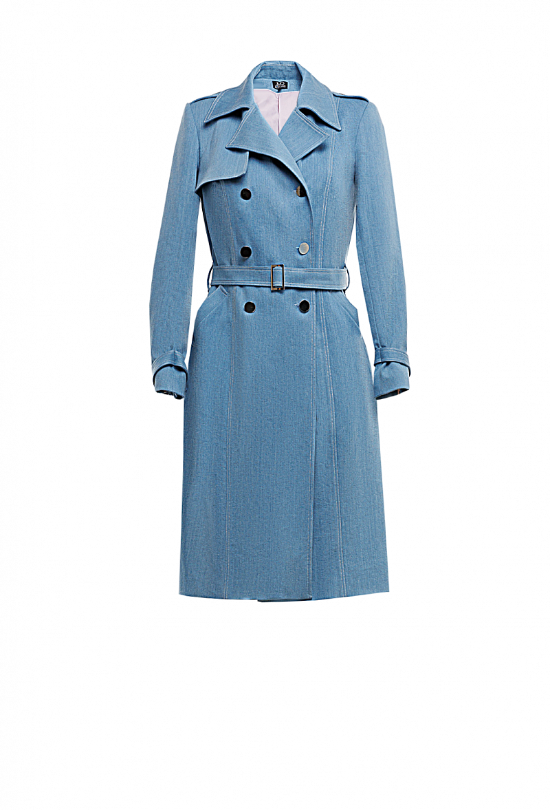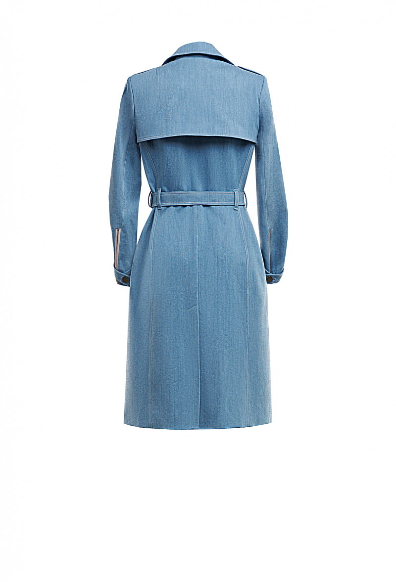 Плащ из джинсовой ткани с поясом, двубортный с английским воротником. С погонами, кокеткой по правой полочке и спинке. На рукавах паты и застежка молния. Карманы листочка.