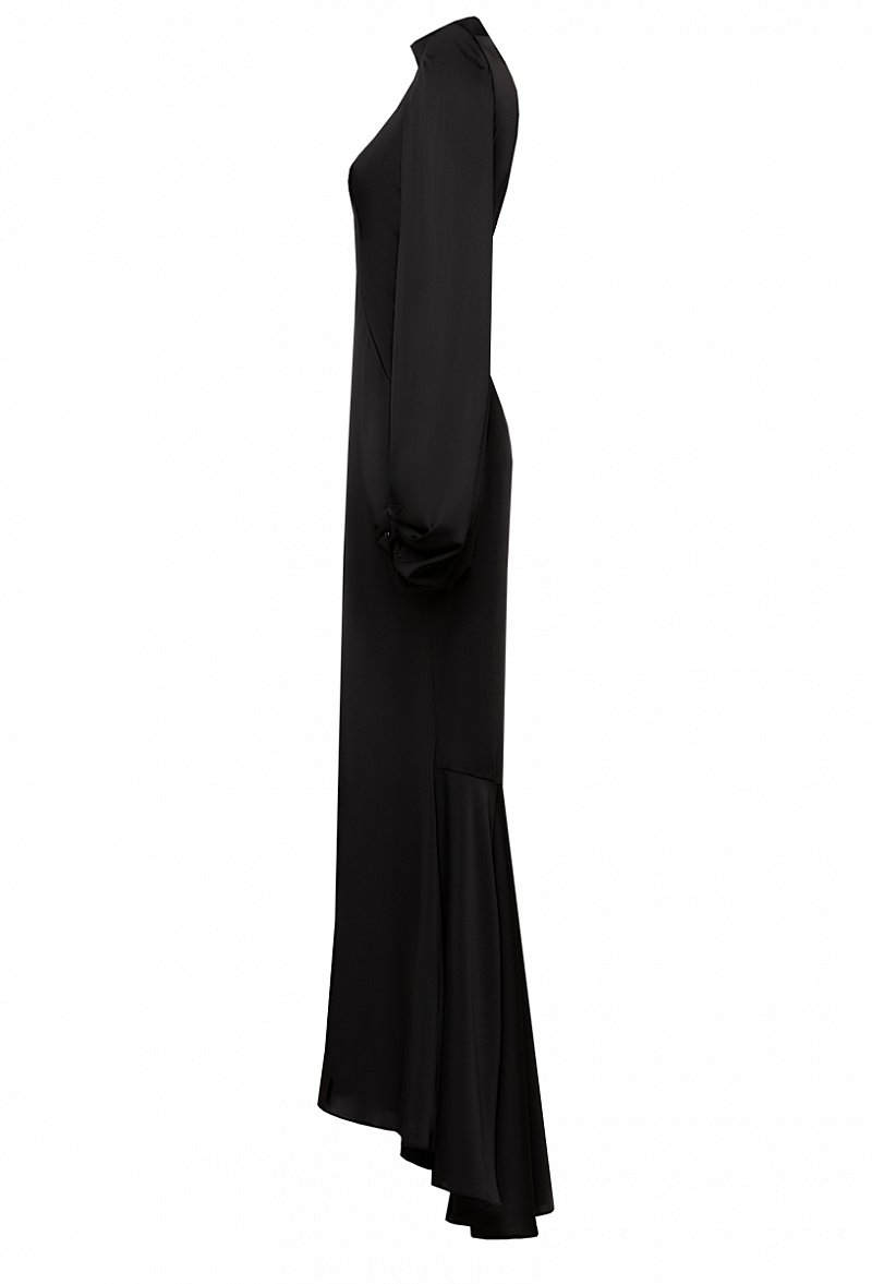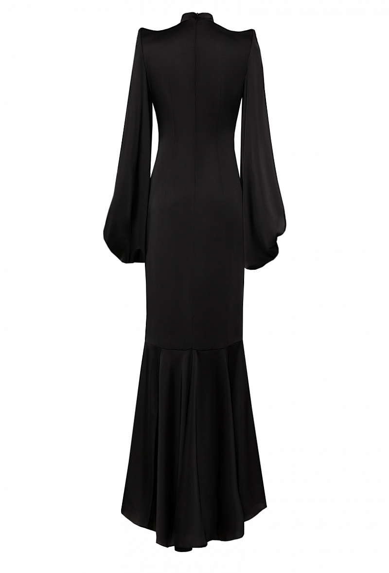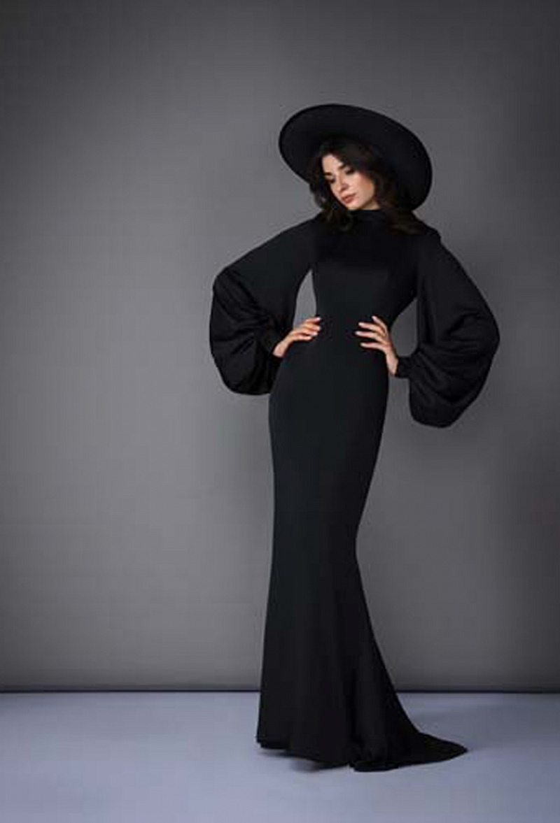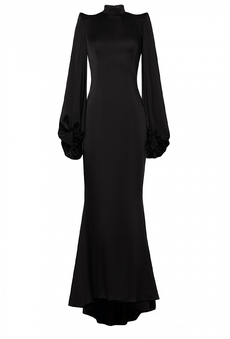 С воротником стойка, с высоким плечом и длинными рукавами в сборку на манжетах.