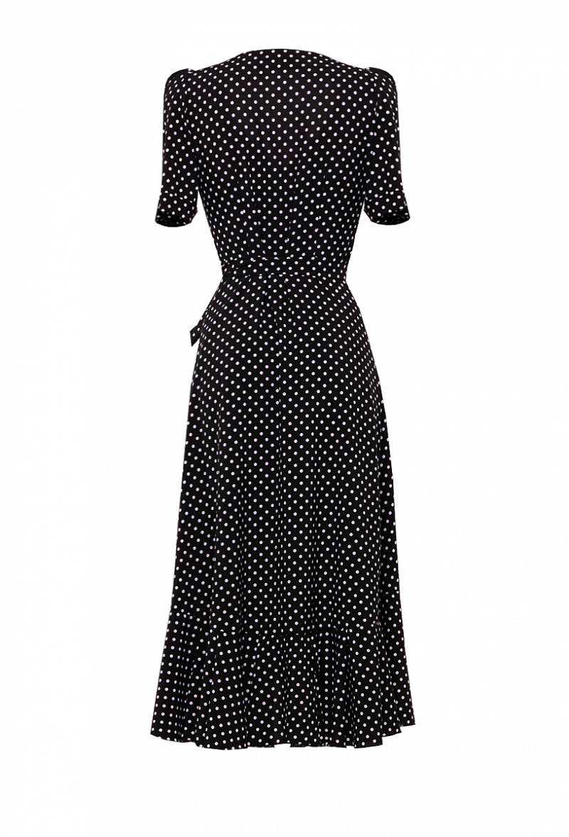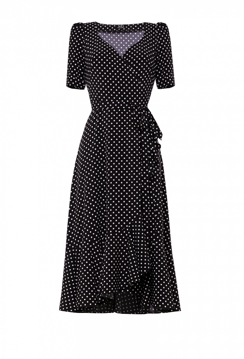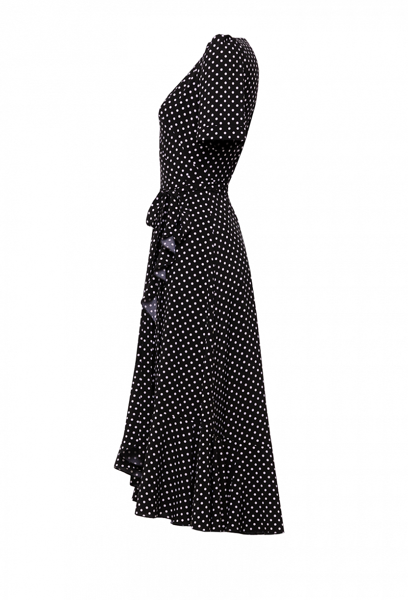 Платье облегающее с запахом. С воланом по низу юбки, с короткими рукавами.