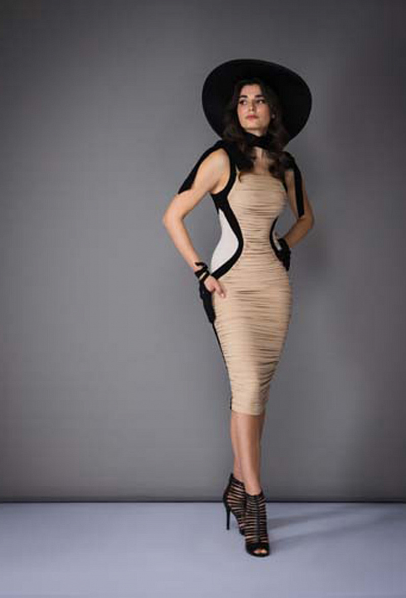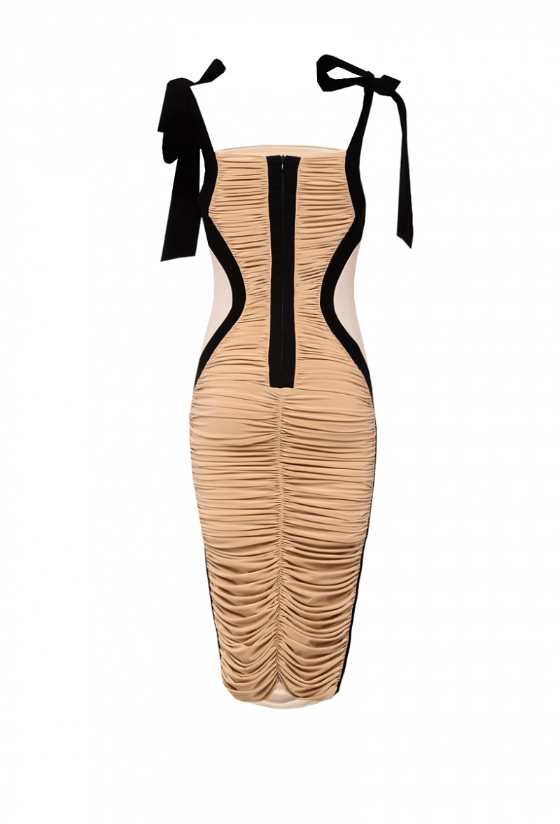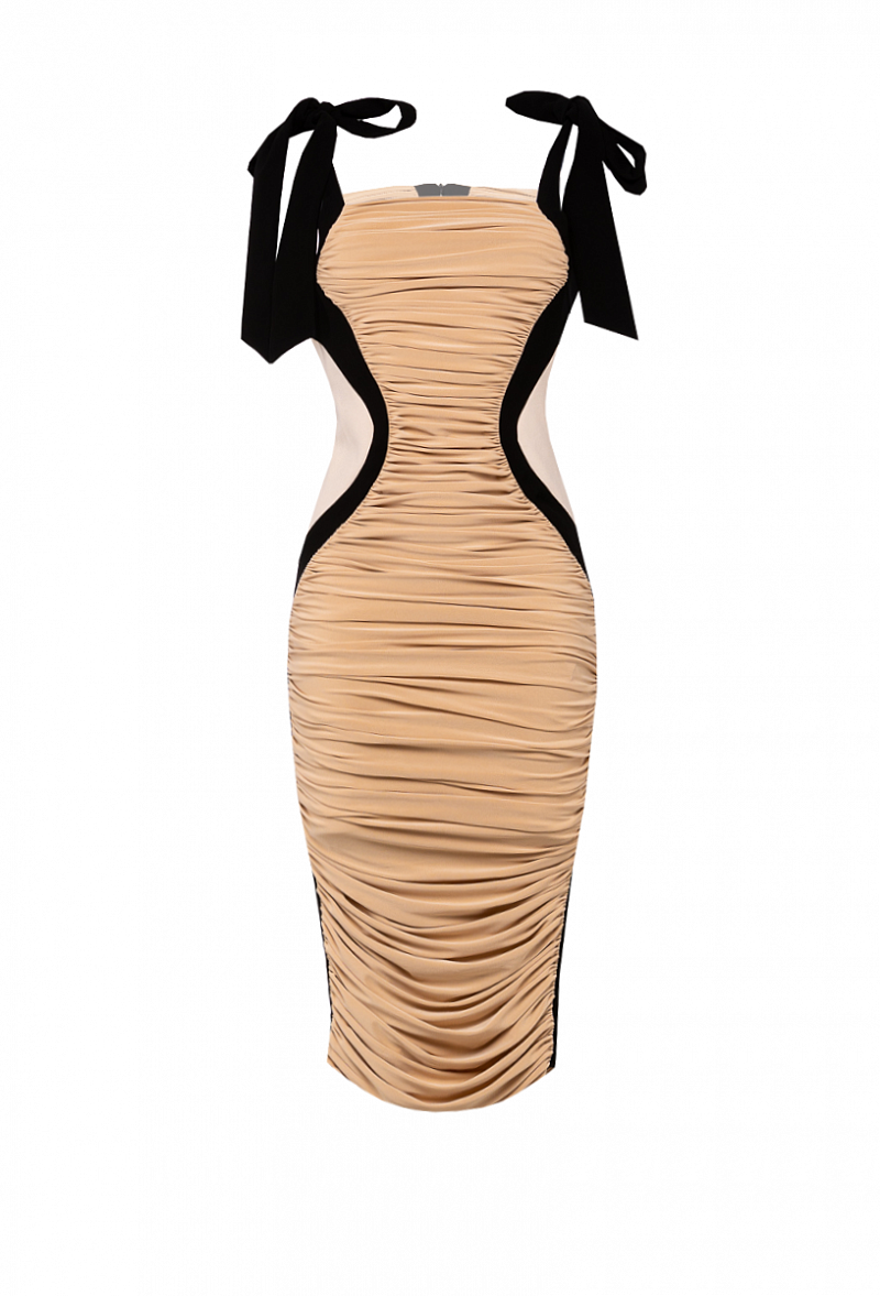 Платье в сборку с боковыми рельефами контрастного цвета.