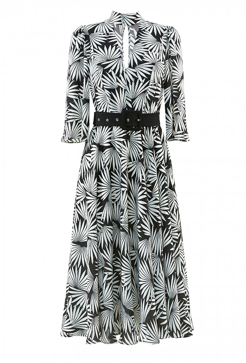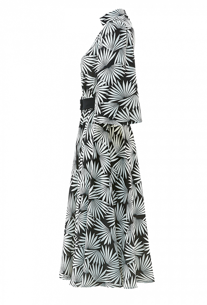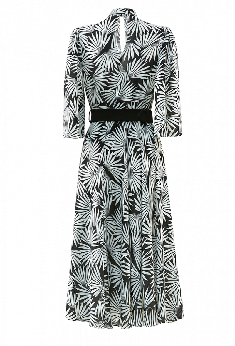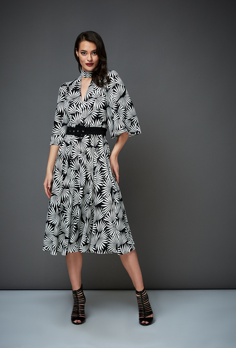 Платье до колена с поясом и с широким рукавом 3/4. Отрезная юбка - солнце. С V-образным вырезом и воротником стойка. Цветочный принт.