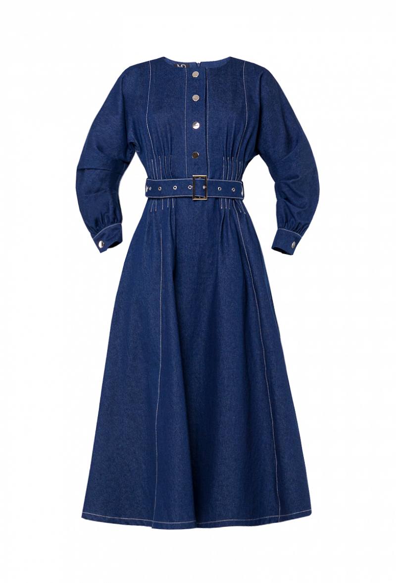 Платье приталенного силуэта, расклешённое по линии низа с разрезами по бокам, по линии талии сформированы вытачки-складки.