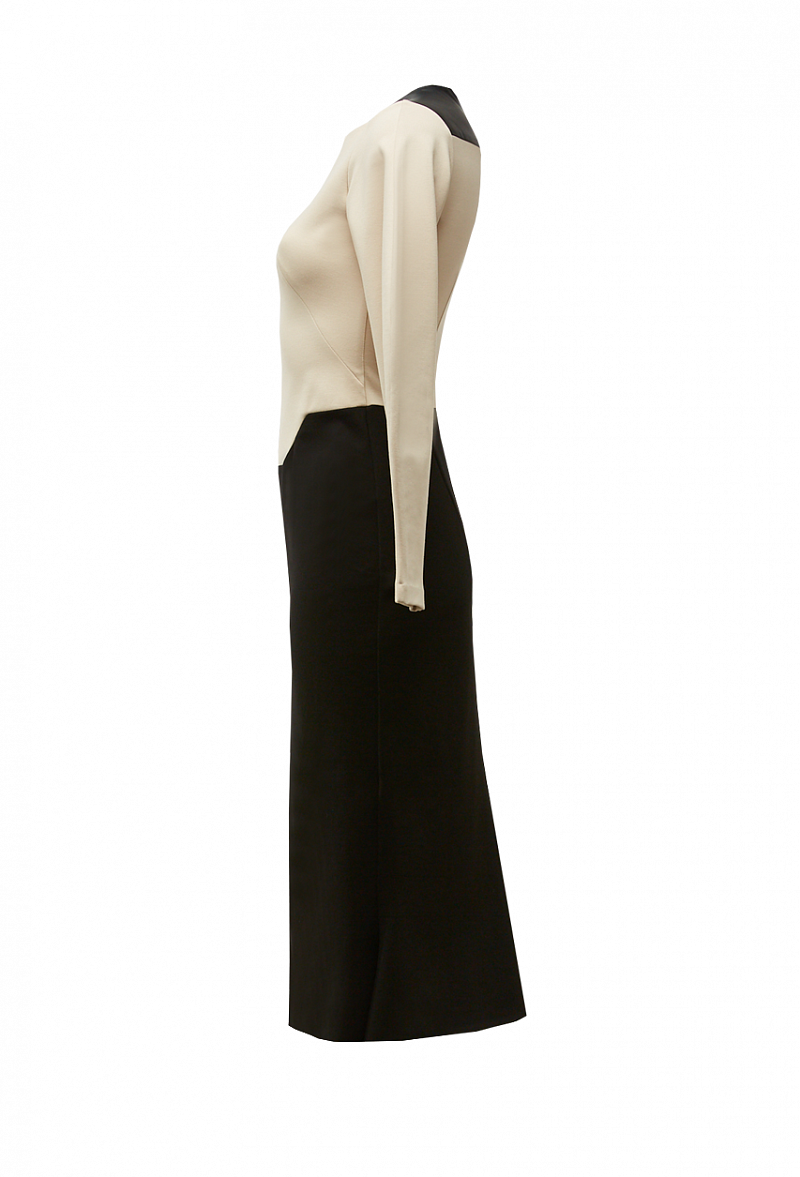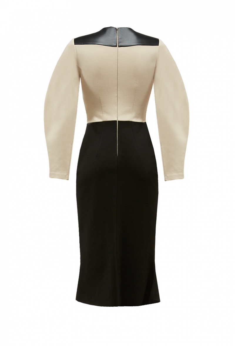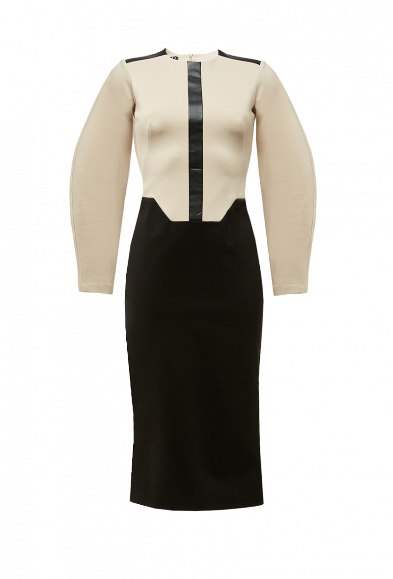 Платье футляр с графическими контрастными вставками в т.ч. из экокожи и фигурным рукавом