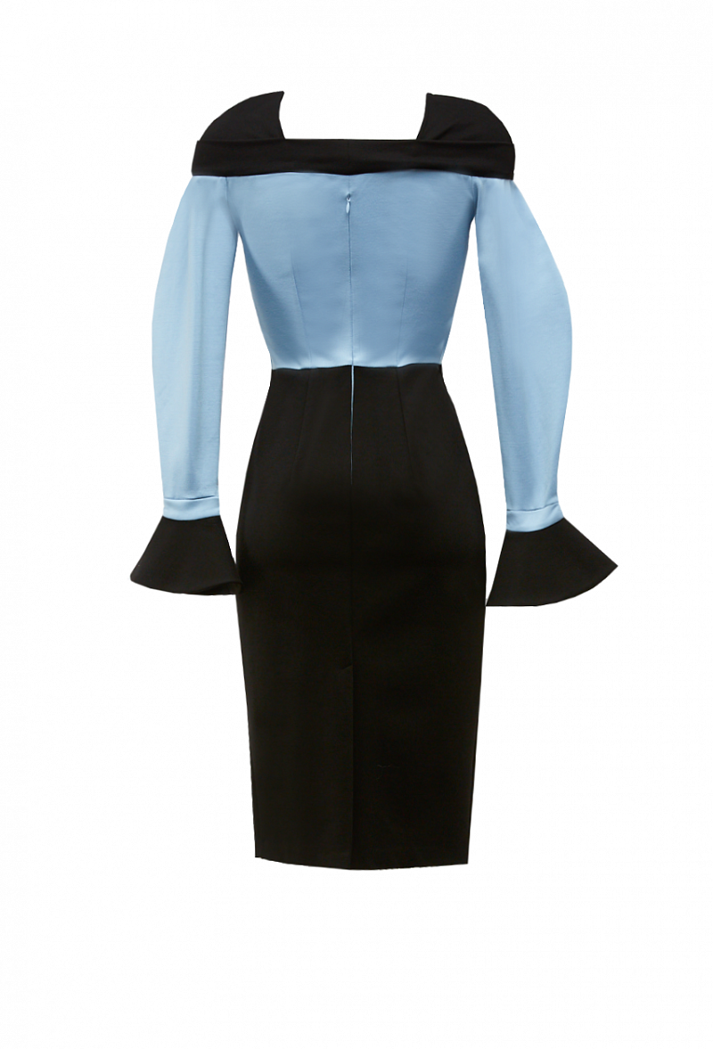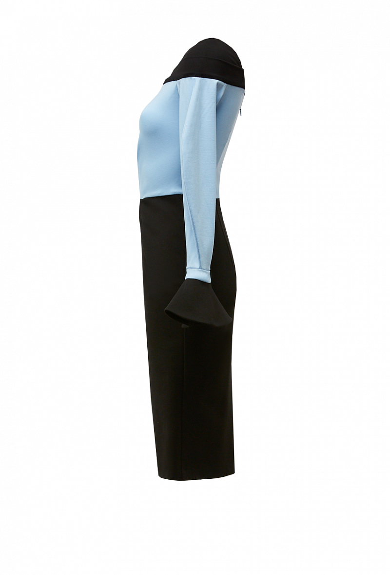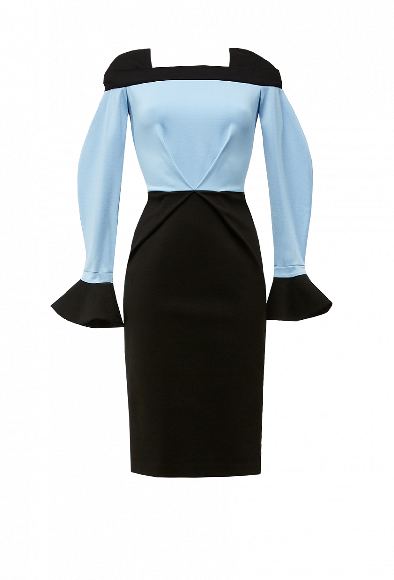 Платье футляр с коре образным вырезом горловины, защипами на уровне талии, фигурным втачным рукавом и манжетами в виде колокола