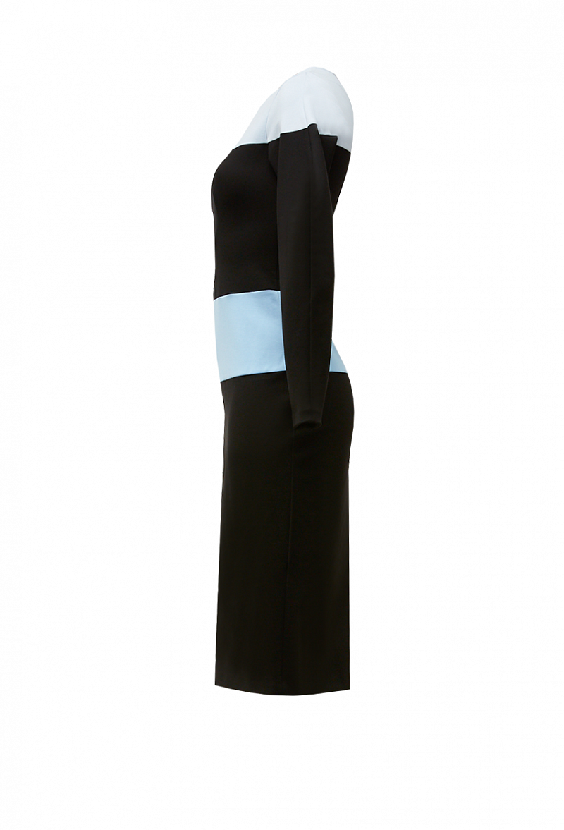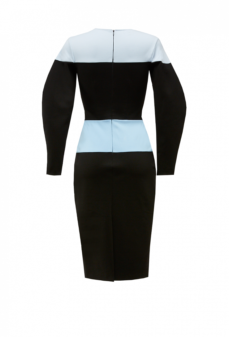 Платье футляр с контрастными вставками на полочке и юбке, фигурным рукавом