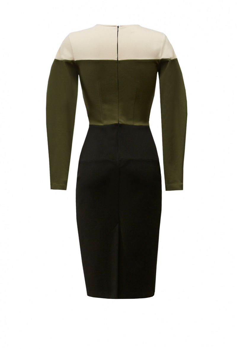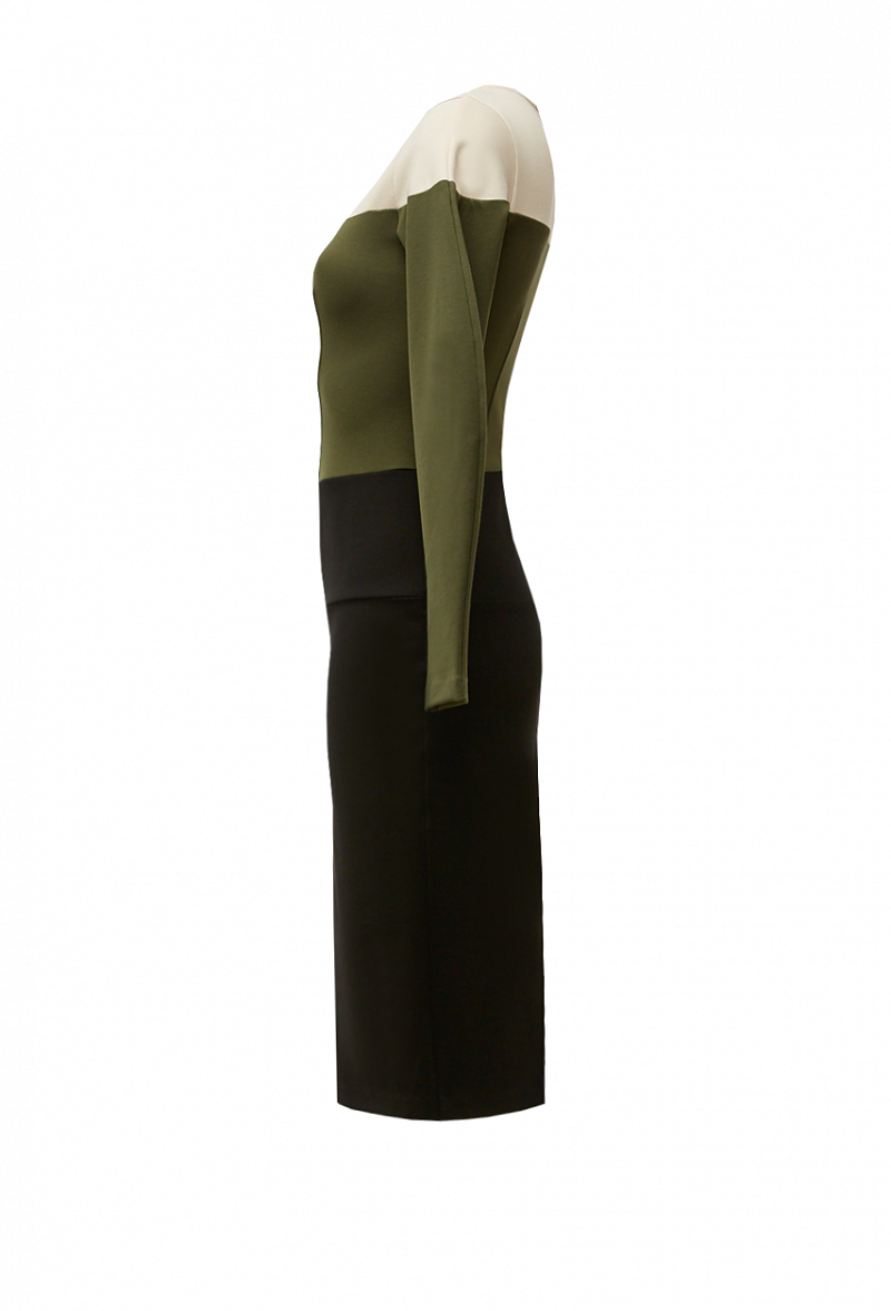 Платье футляр с контрастными вставками на полочке и юбке, фигурным рукавом