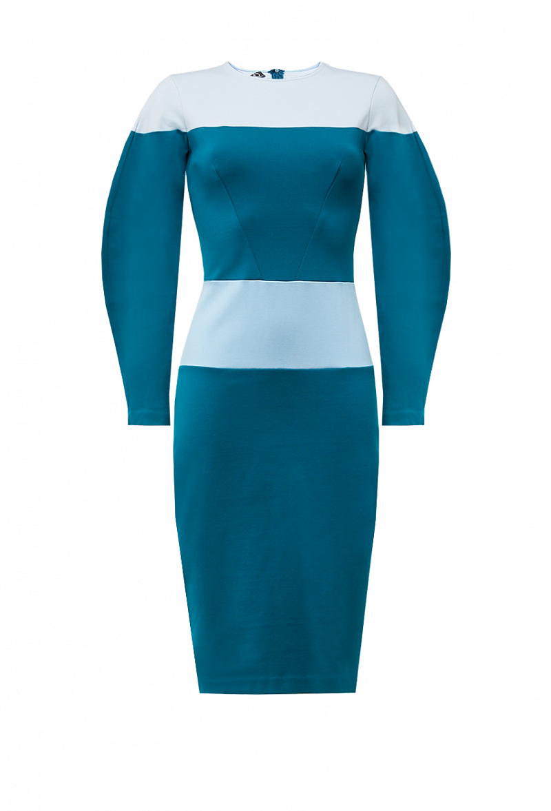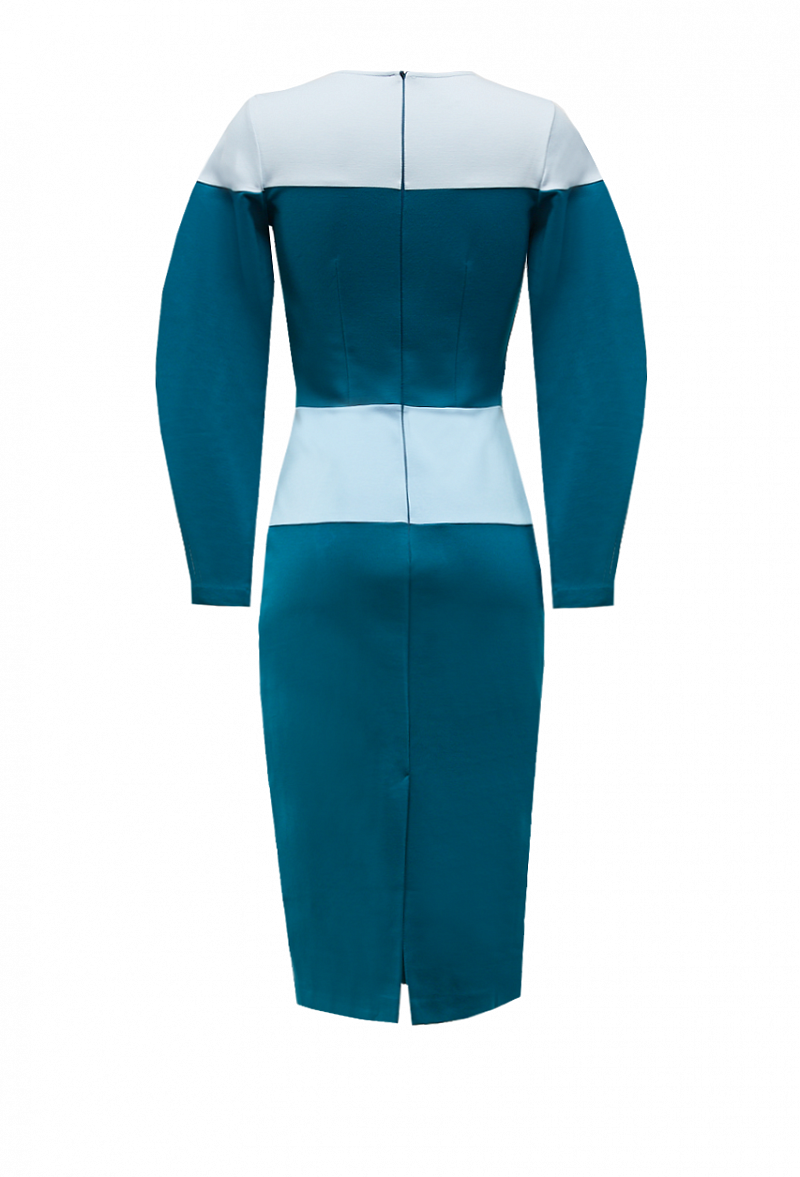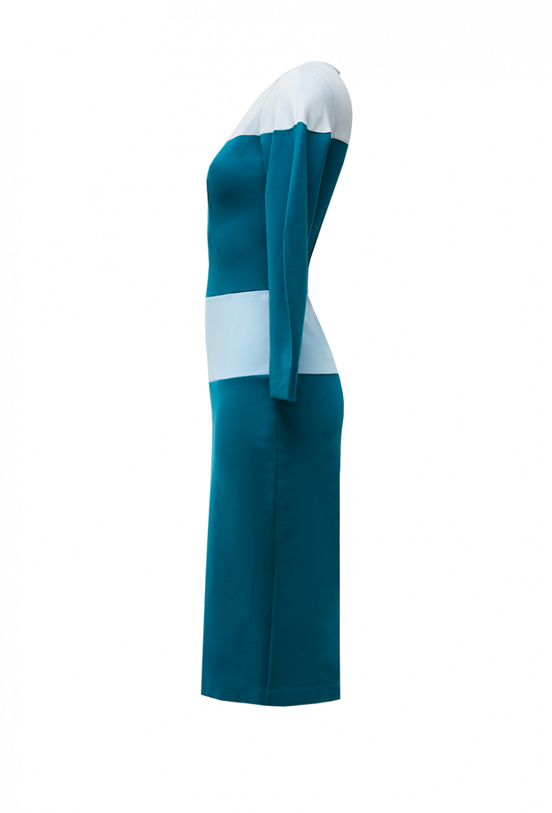 Платье футляр с контрастными вставками на полочке и юбке, фигурным рукавом