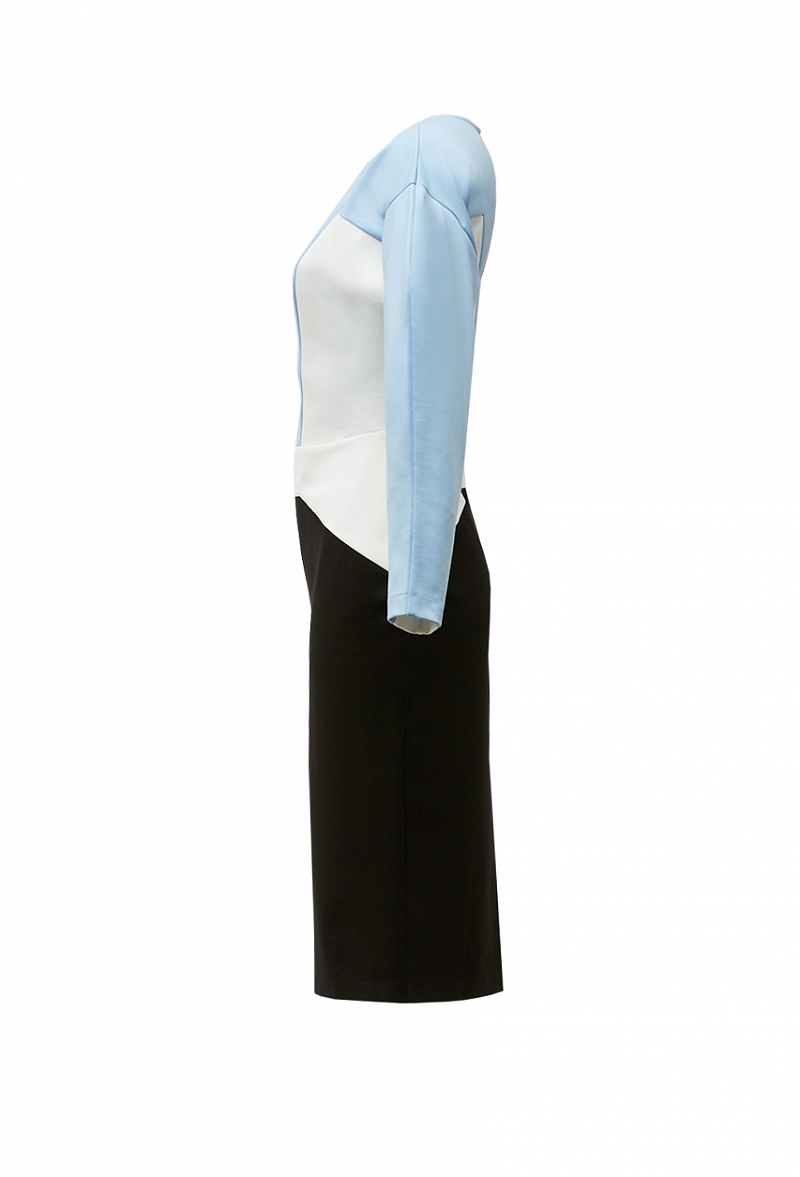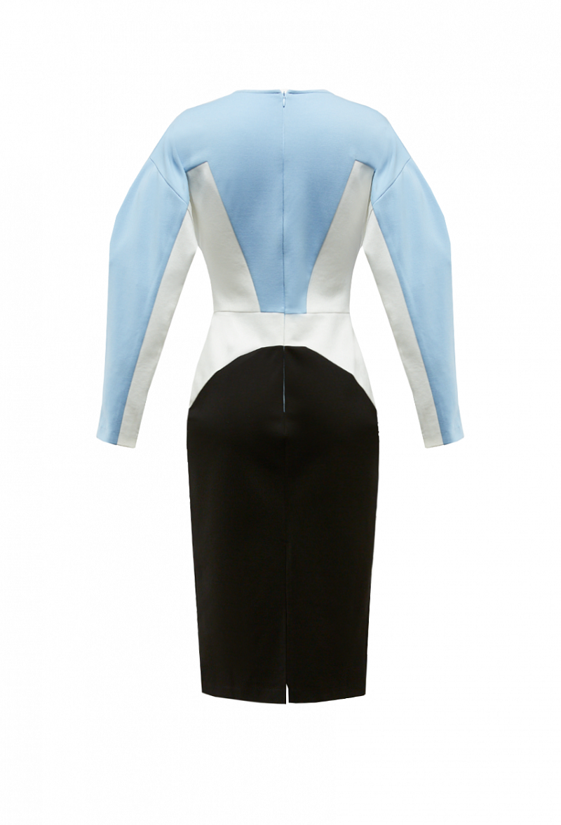 Платье футляр с фигурным рукавом, юбкой с кокеткой, графической (овальной) вставкой переходящей на полочку
