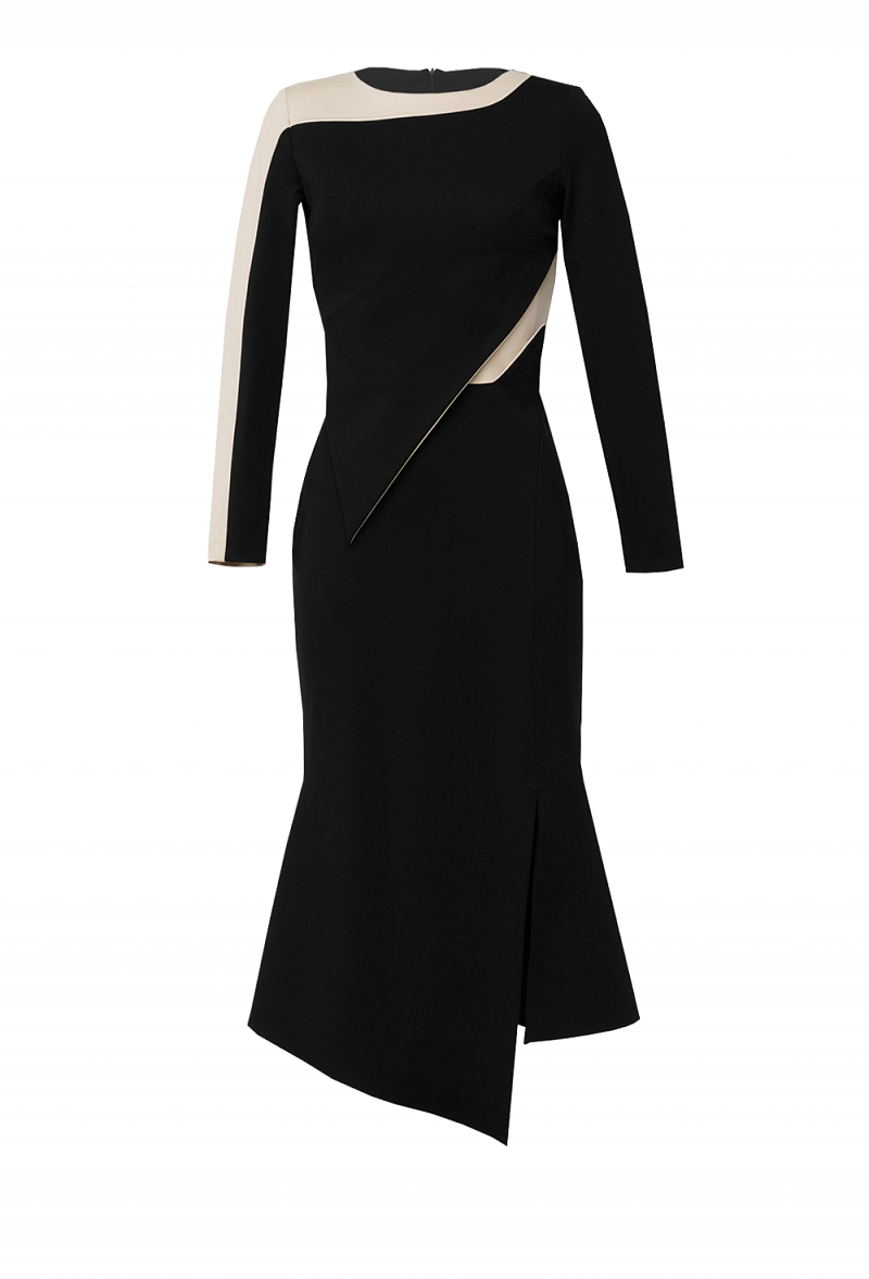Платье футляр, горловина «лодочка», ассиметричная юбка годе с разрезом по колену, на полочке декоративная отлитная деталь