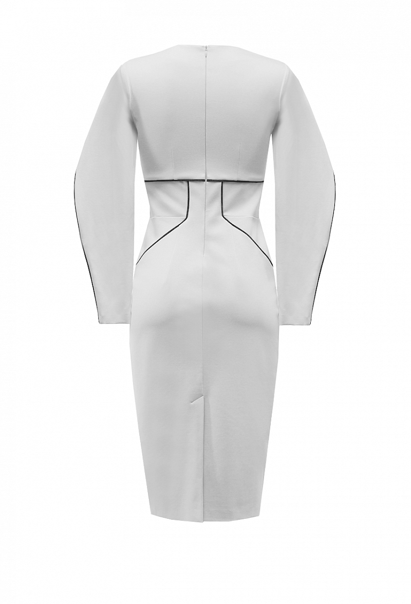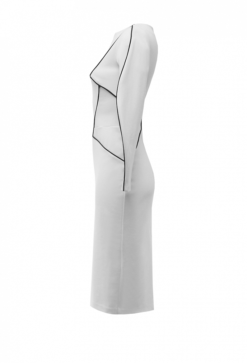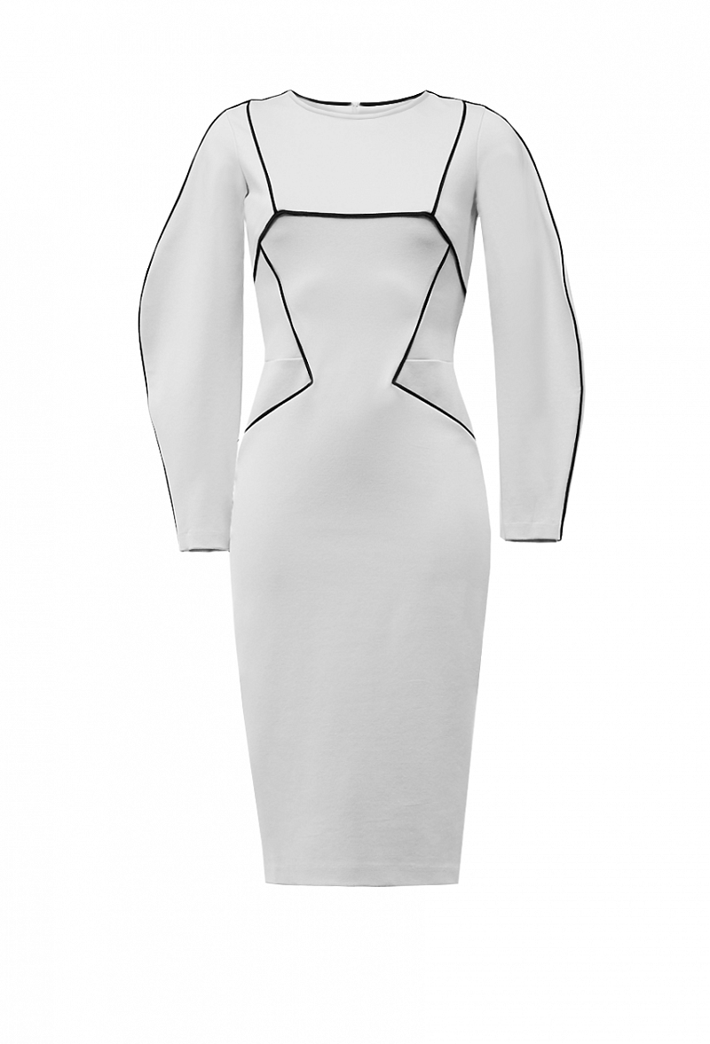Платье футляр с графическими контрастными элементами и фигурным рукавом