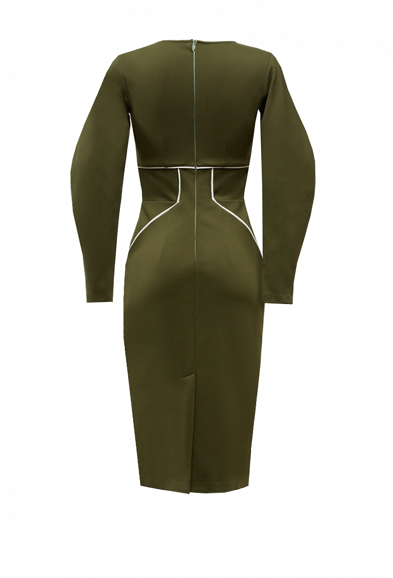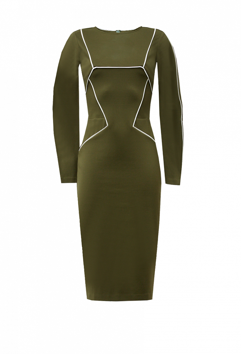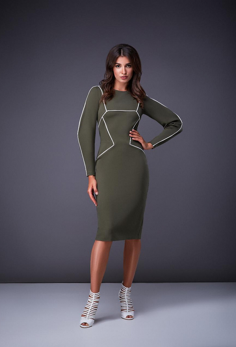 Платье футляр с графическими контрастными элементами и фигурным рукавом