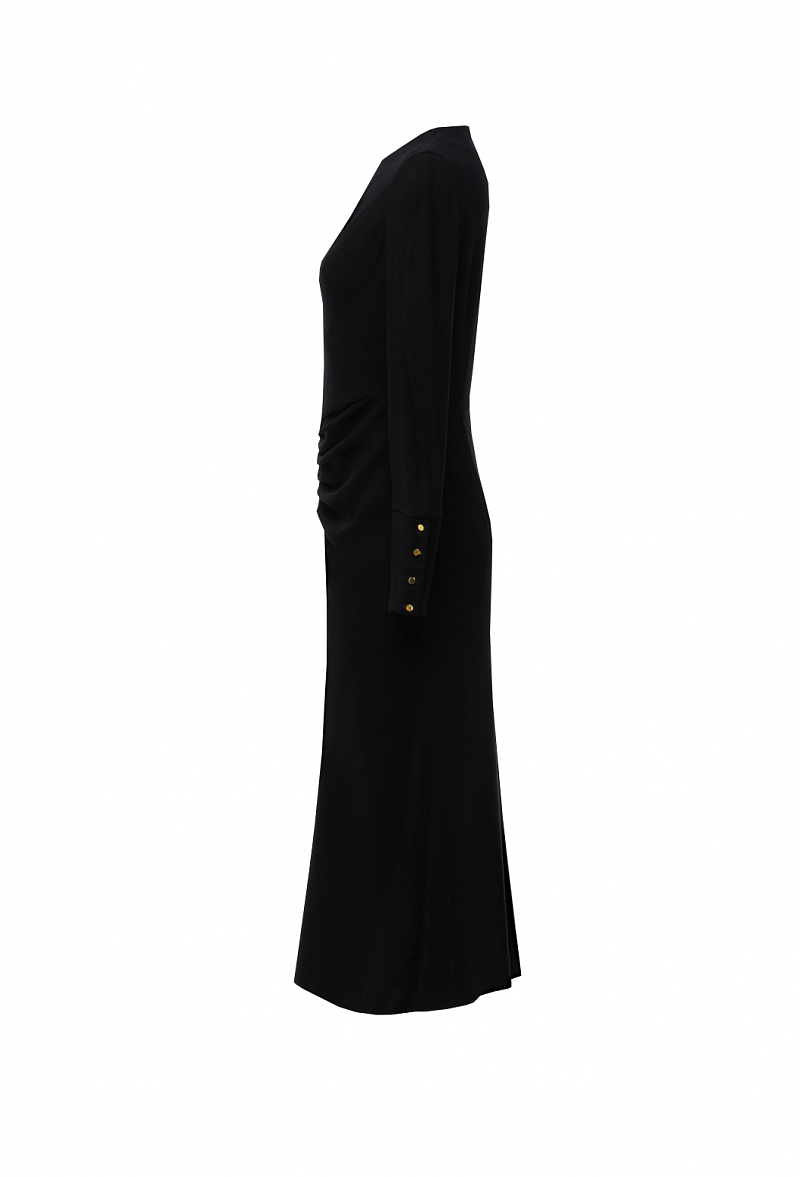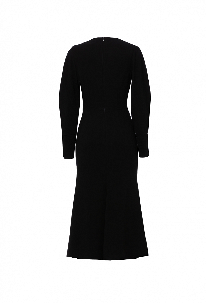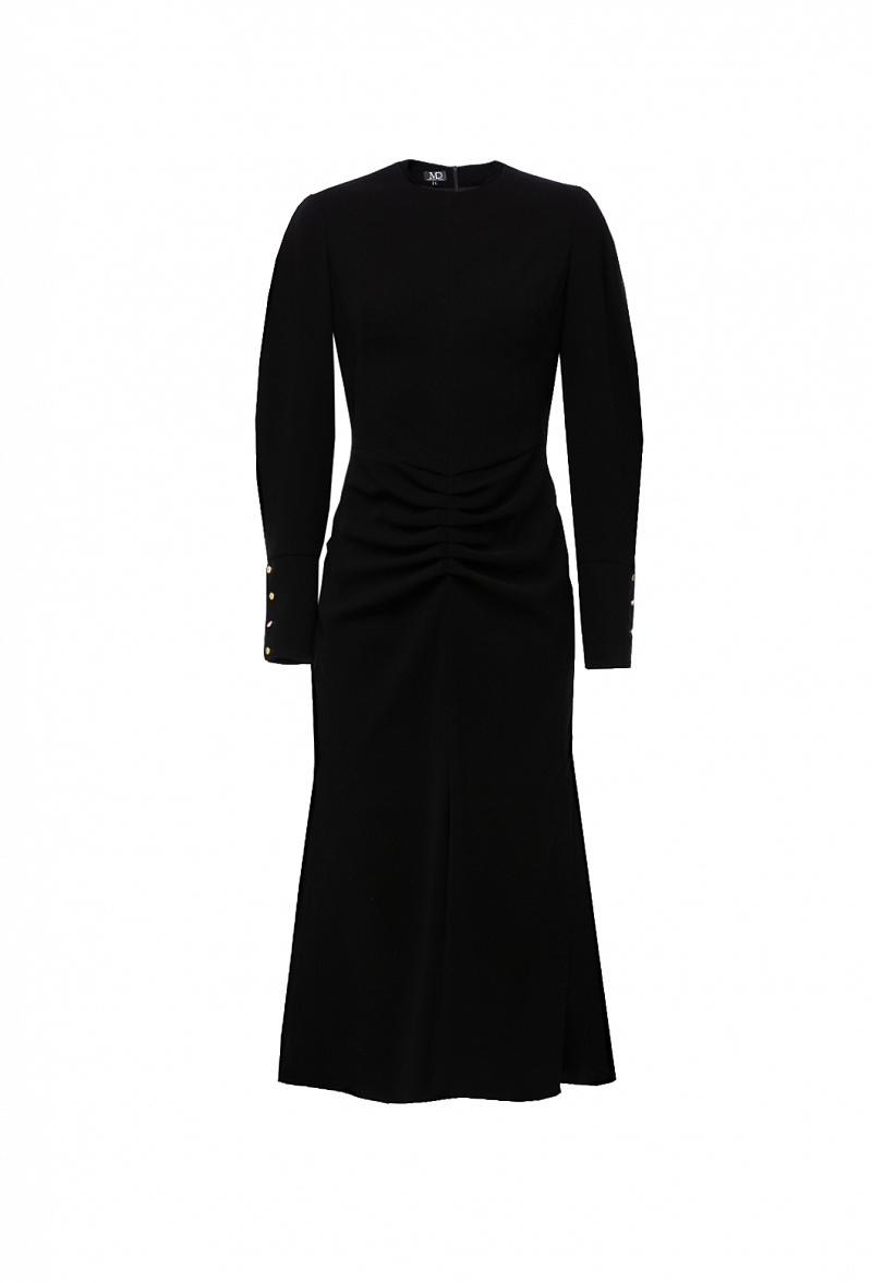 Платье-футляр из крепа с отрезной талией. Рукав объёмный втачной, с высоким манжетом на четырёх золотых пуговицах.