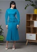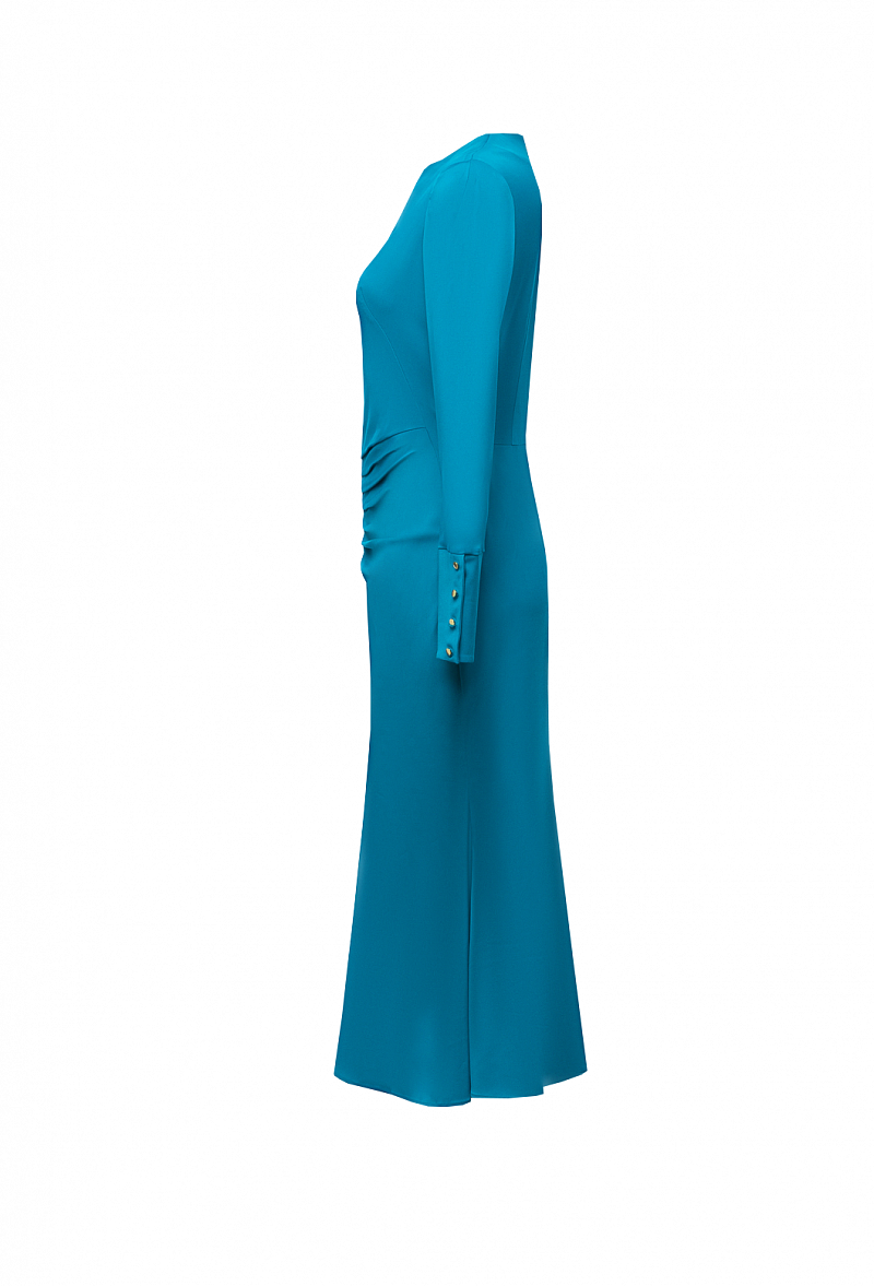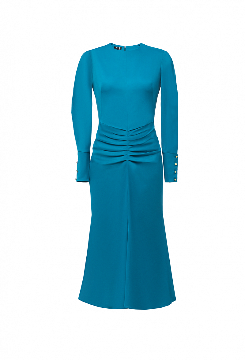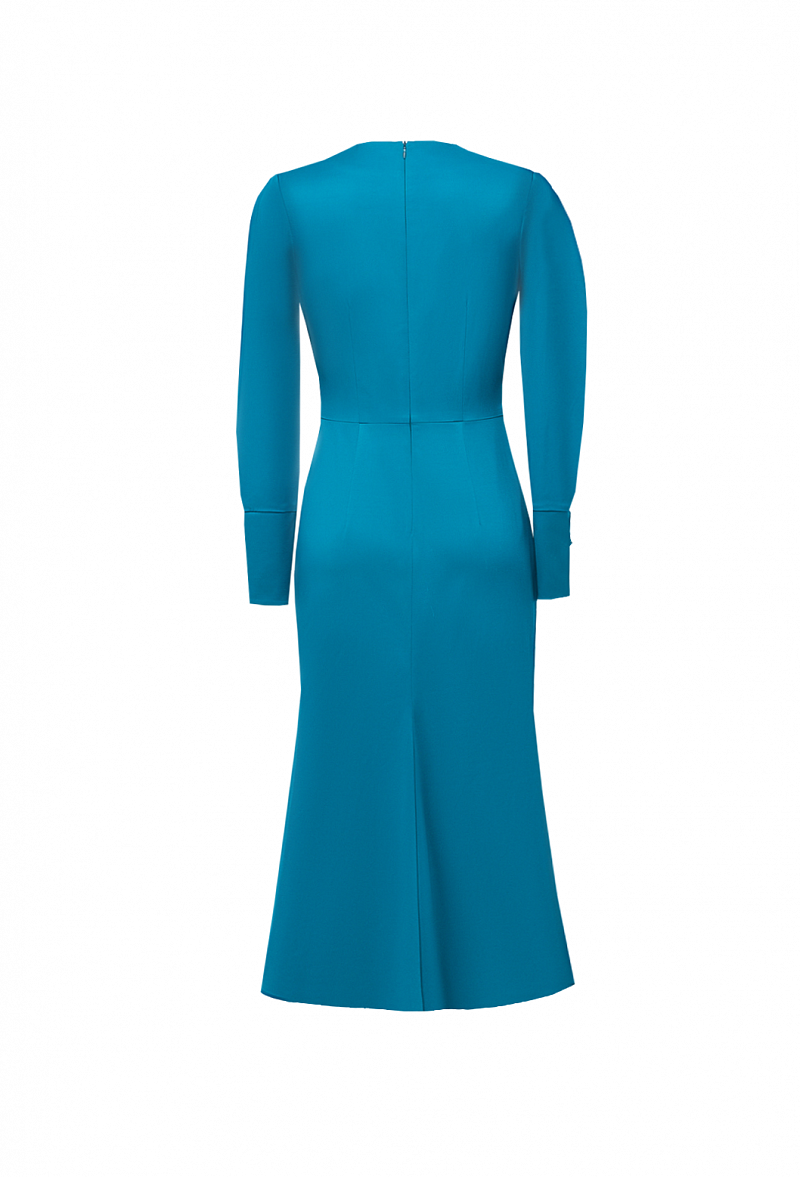 Платье-футляр из крепа с отрезной талией. Рукав объёмный втачной, с высоким манжетом на четырёх золотых пуговицах.