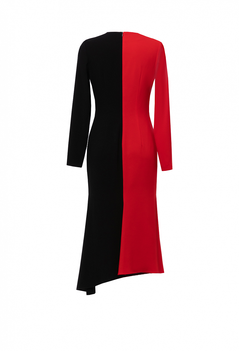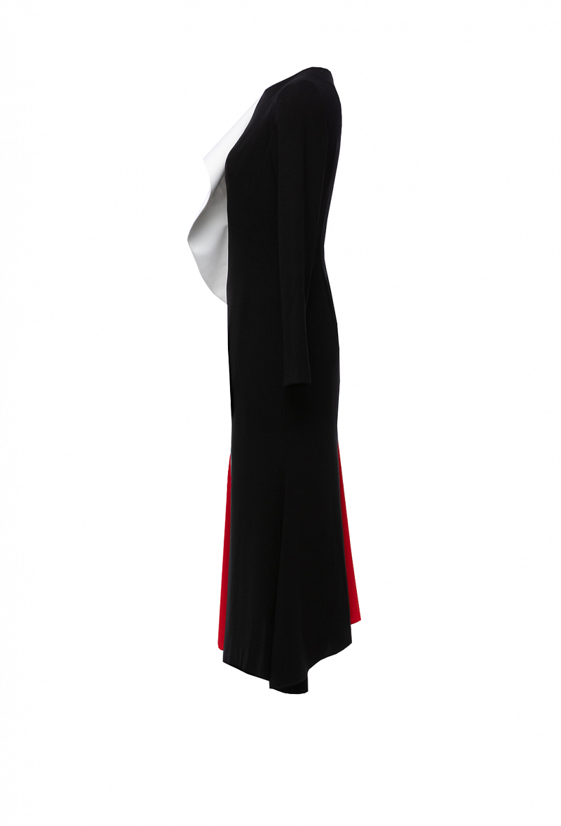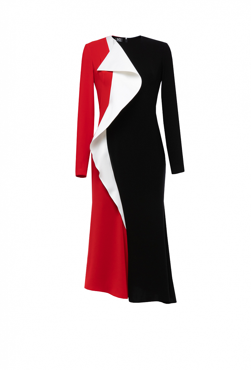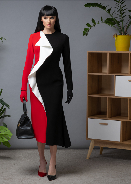 Платье-футляр из крепа с юбкой гаде, ассиметричным низом и белым воланом по полочке. Рукав втачной.