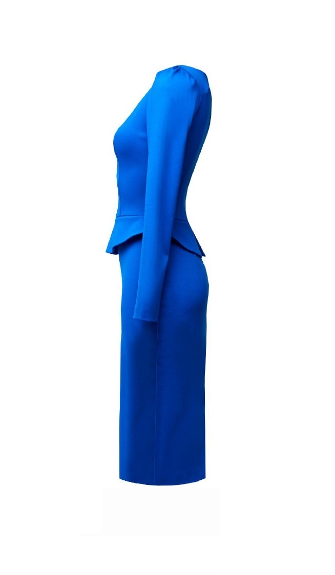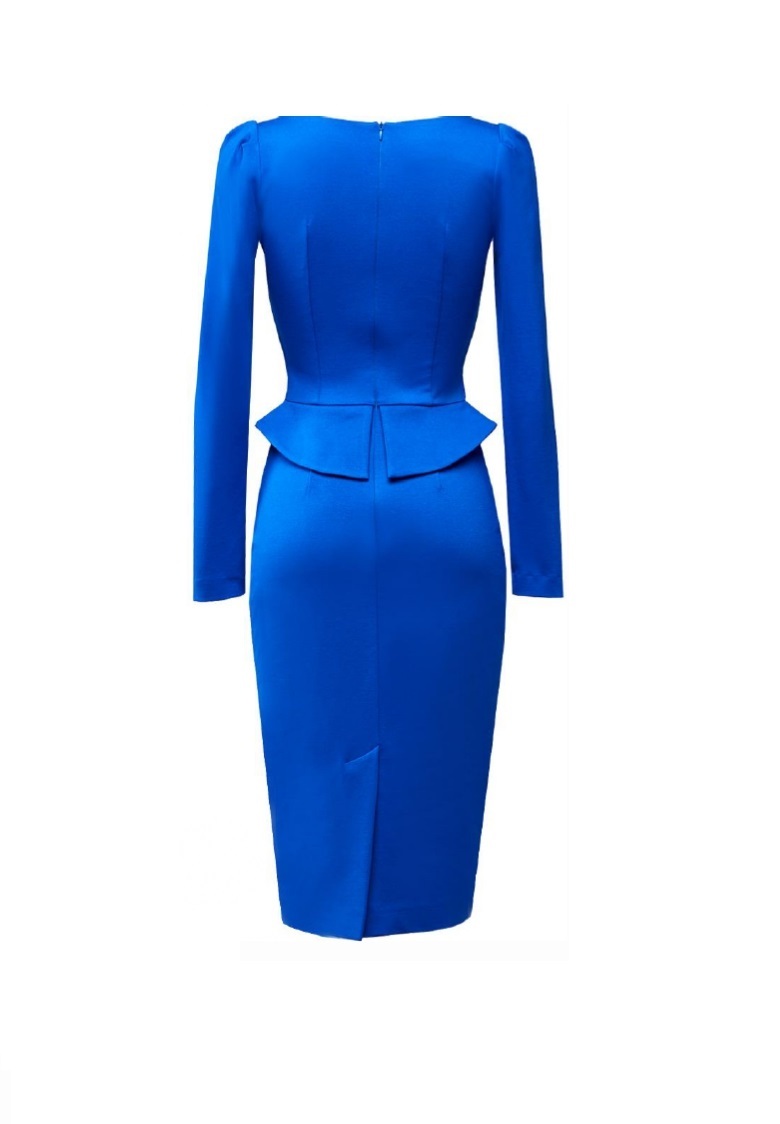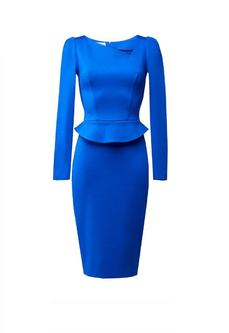 Платье футляр с баской, ассиметричная горловина, рукава со складками на плечах.