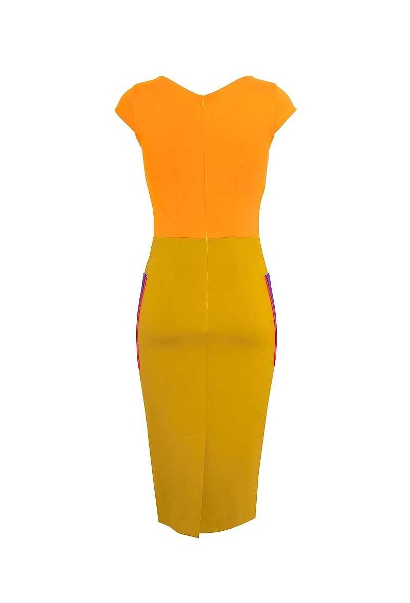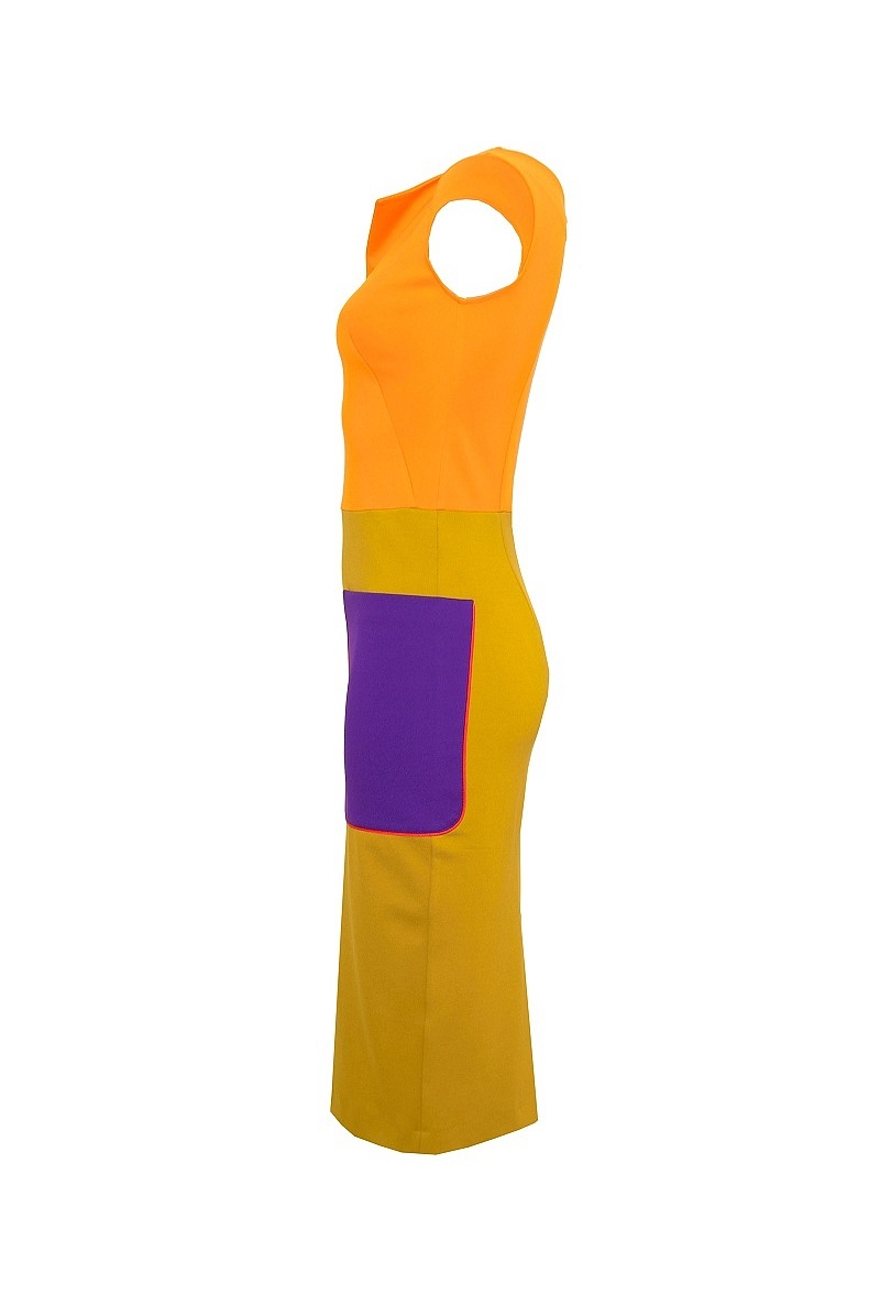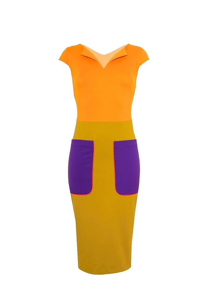 Трикотажное платье-футляр со спущенными рукавами и контрастными накладными карманами.
