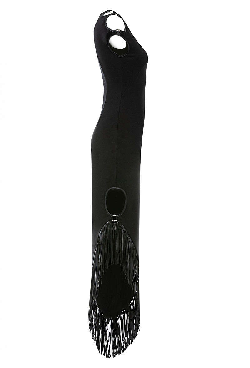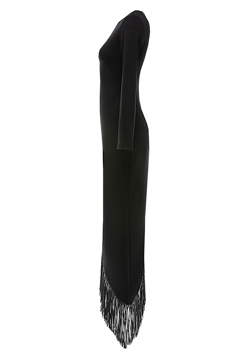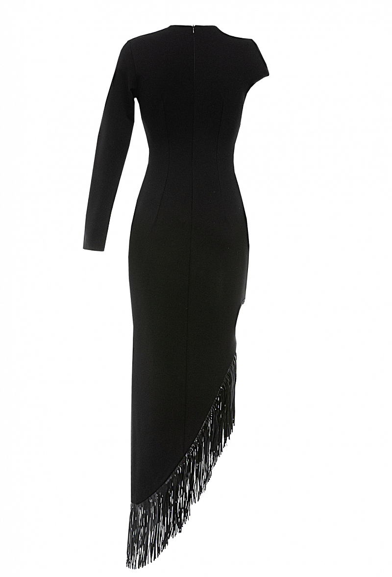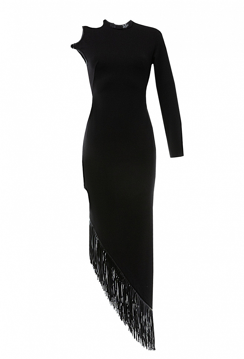 Трикотажное платье-футляр с одним длинным рукавом, второе плечо декорировано кольцами. Срез низа платья под углом, отделка бахрома из экокожи.